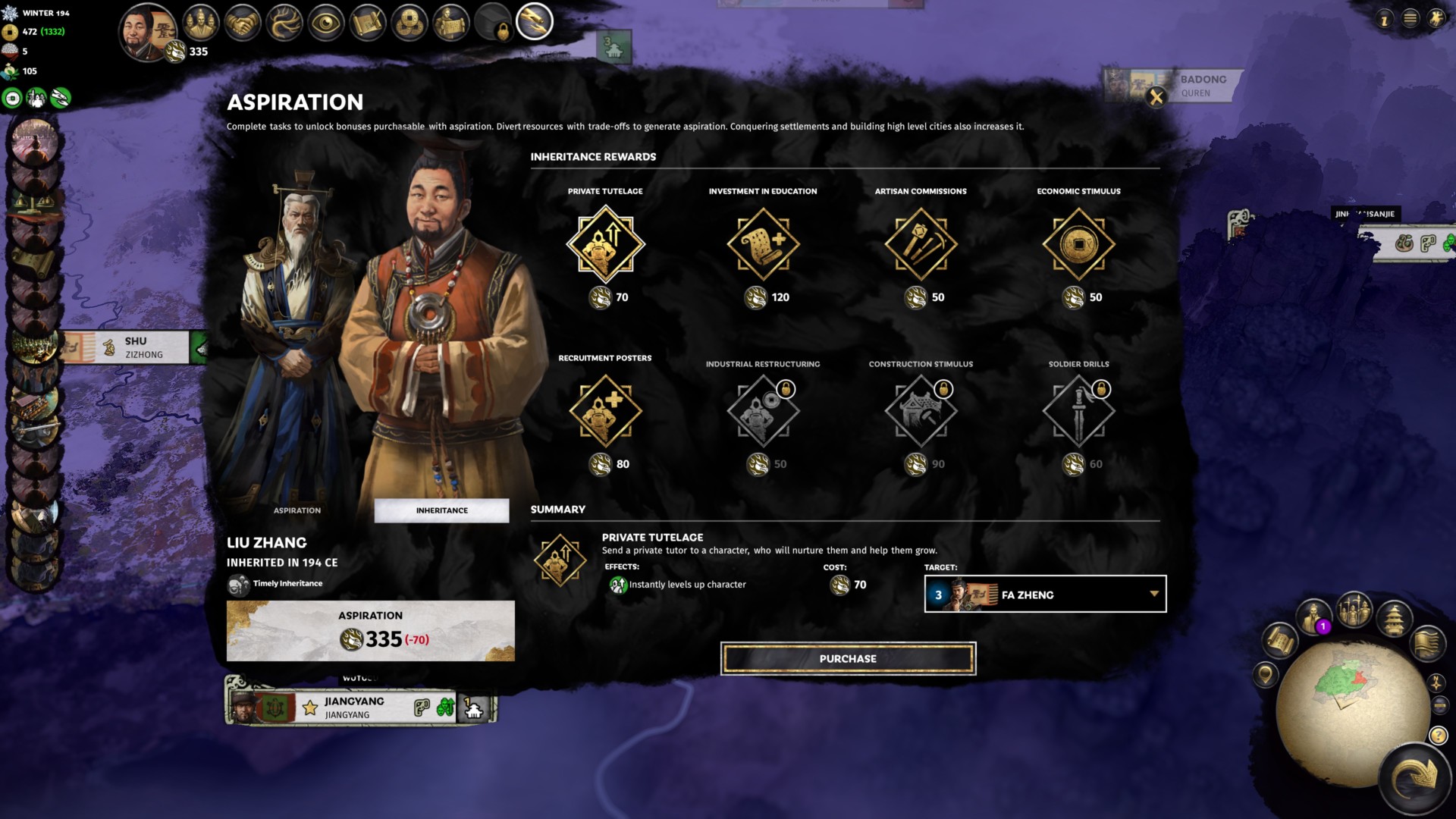 Even if we don’t have a lot of Aspiration Points, you can use “Investment in Education” (faction-wide), as well “Private Tutelage” on Fa Zheng so he can have the +commerce income administrator perk.