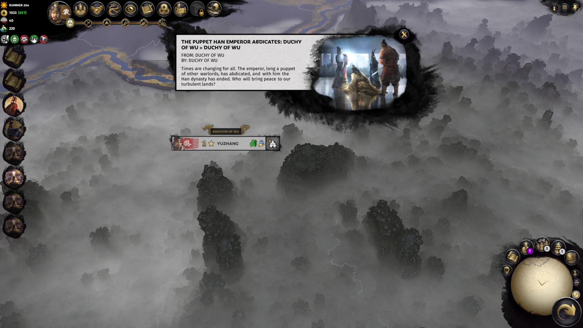 Now, even if Gong Du didn’t pose a threat (or you took him out), the Little Conqueror, Sun Ce, can still ruin your plans to restore the Han. More often than not, he’ll have enough prestige to become King around turn 25. It doesn’t matter if Emperor Xian is already in your domains as AI Sun Ce’s declaration will automatically force the Han Emperor to abdicate.