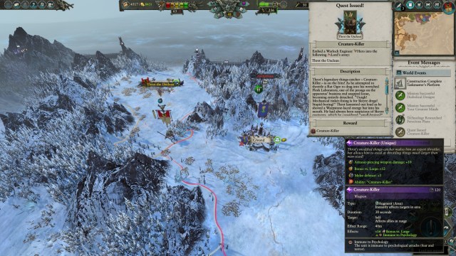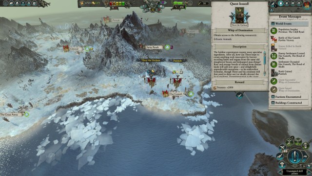 - Obtain access to the exotic animals resource – This actually took me a while to figure out. It looks like Cragorth Deep is the nearest settlement that has exotic animals. By then, Malekith will likely be in control of this area. The other alternative is Bleak Hold Fortress’ special building which produces exotic animals.