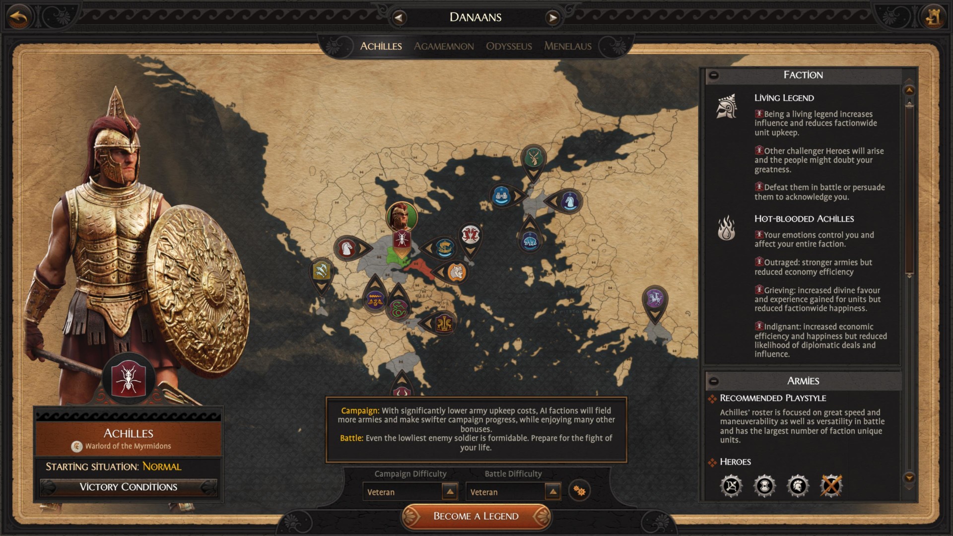 Achilles has two unique mechanics: Hot-blooded Achilles and Living Legend. The former represents his erratic and, at times, violent mood swings. The latter, meanwhile, will remind you of Lu Bu’s “Greatest Warriors” tallies in Total War: Three Kingdoms – A World Betrayed. Both of these features will be integral to your Total War Saga: Troy campaign.