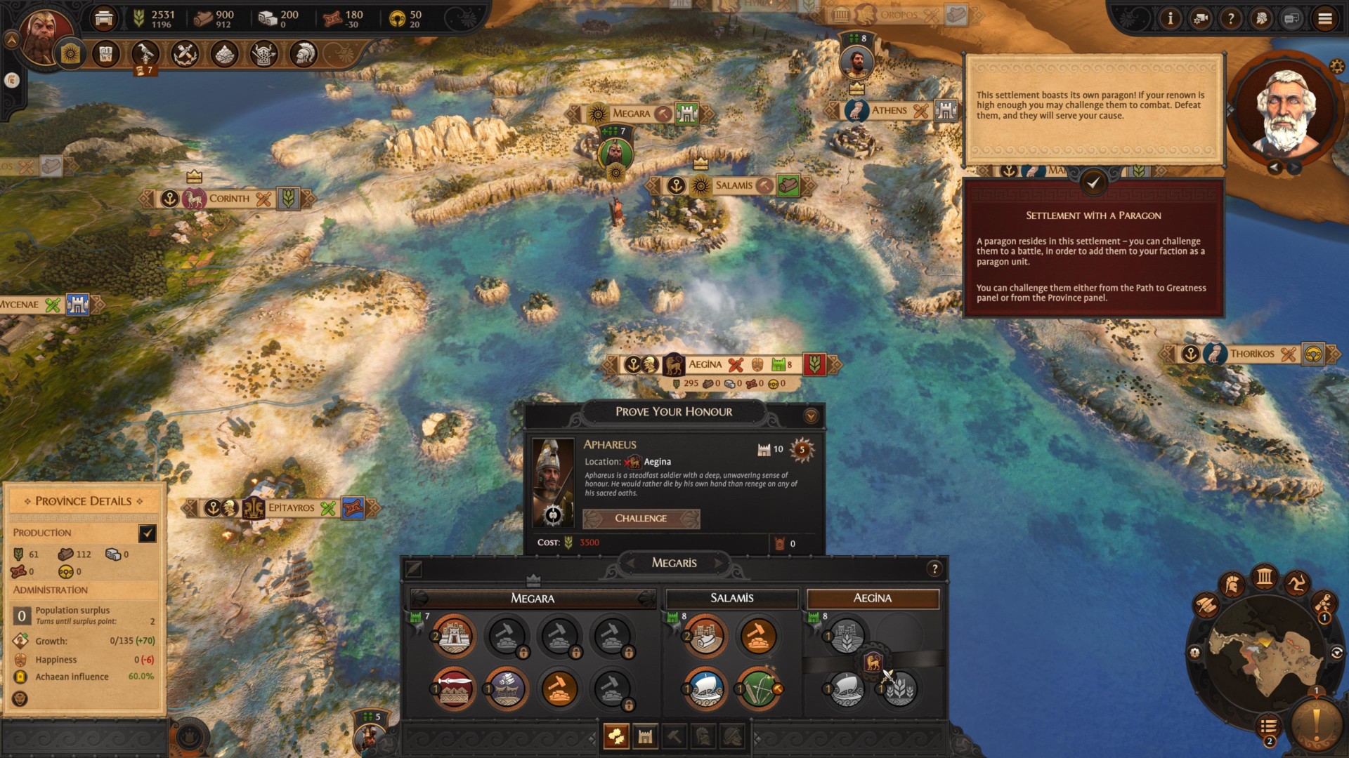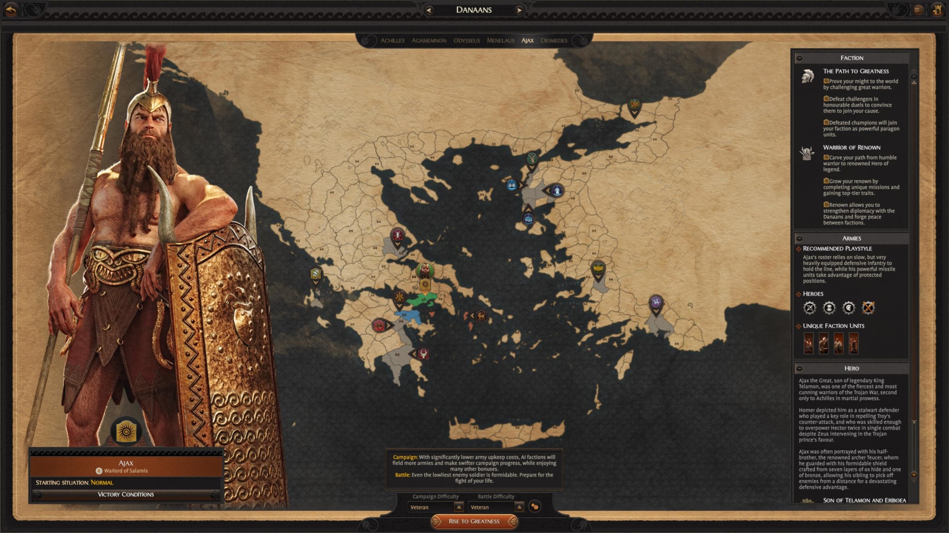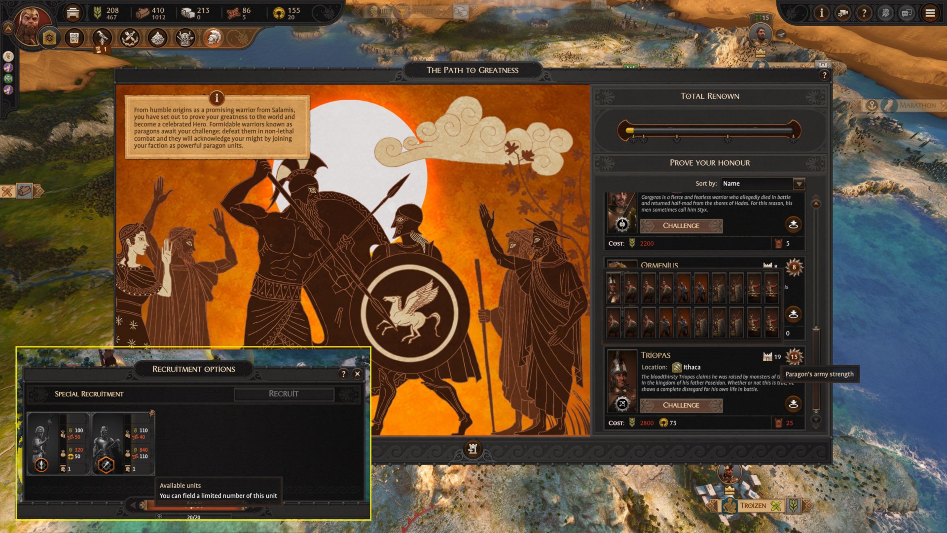 Think of Ajax’s Path to Greatness as somewhat akin to Achilles’ Living Legend mechanic. The Path to Greatness panel shows several paragon generals for you to fight, though many require some renown and resources. Once you click on the “challenge” button, the general’s army will spawn on the indicated location.