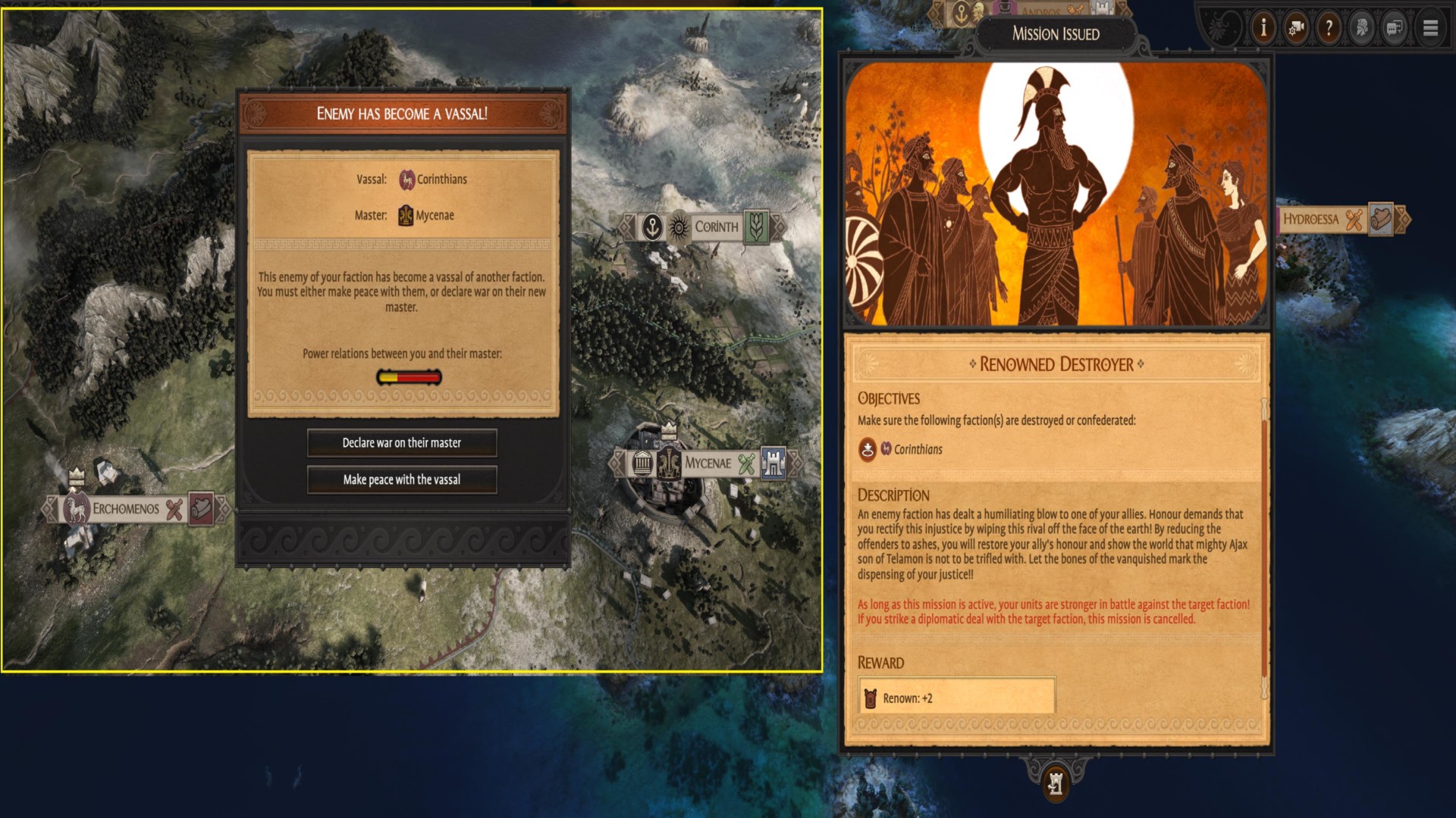 Note: If Agamemnon vassalizes the Corinthians, kiss your opportunity goodbye. You need to wait until he confederates the faction to complete the renown mission. Alternatively, you can choose to go for the faction leader, but that dude’s army gets destroyed too fast.