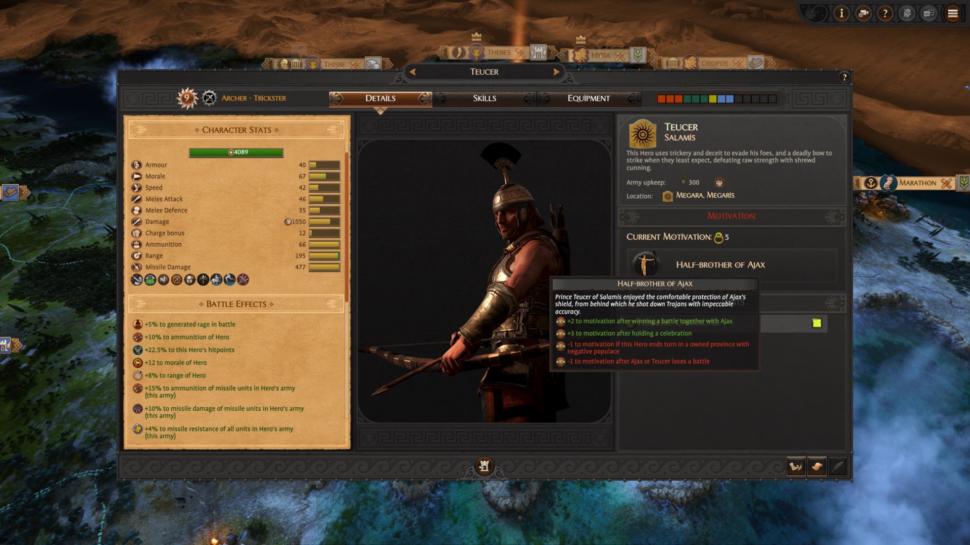 Note: For some reason, Teucer always remains in Ajax’s hero recruitment pool even if you fielded someone else earlier on. However, if you picked Teucer first, some of the other Homeric characters might disappear after a turn has elapsed.