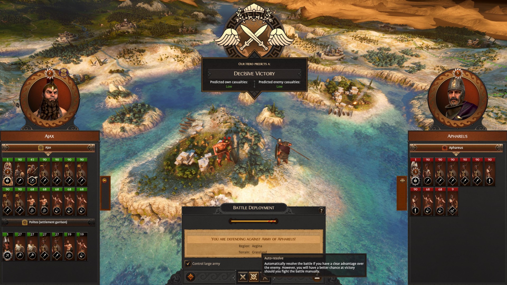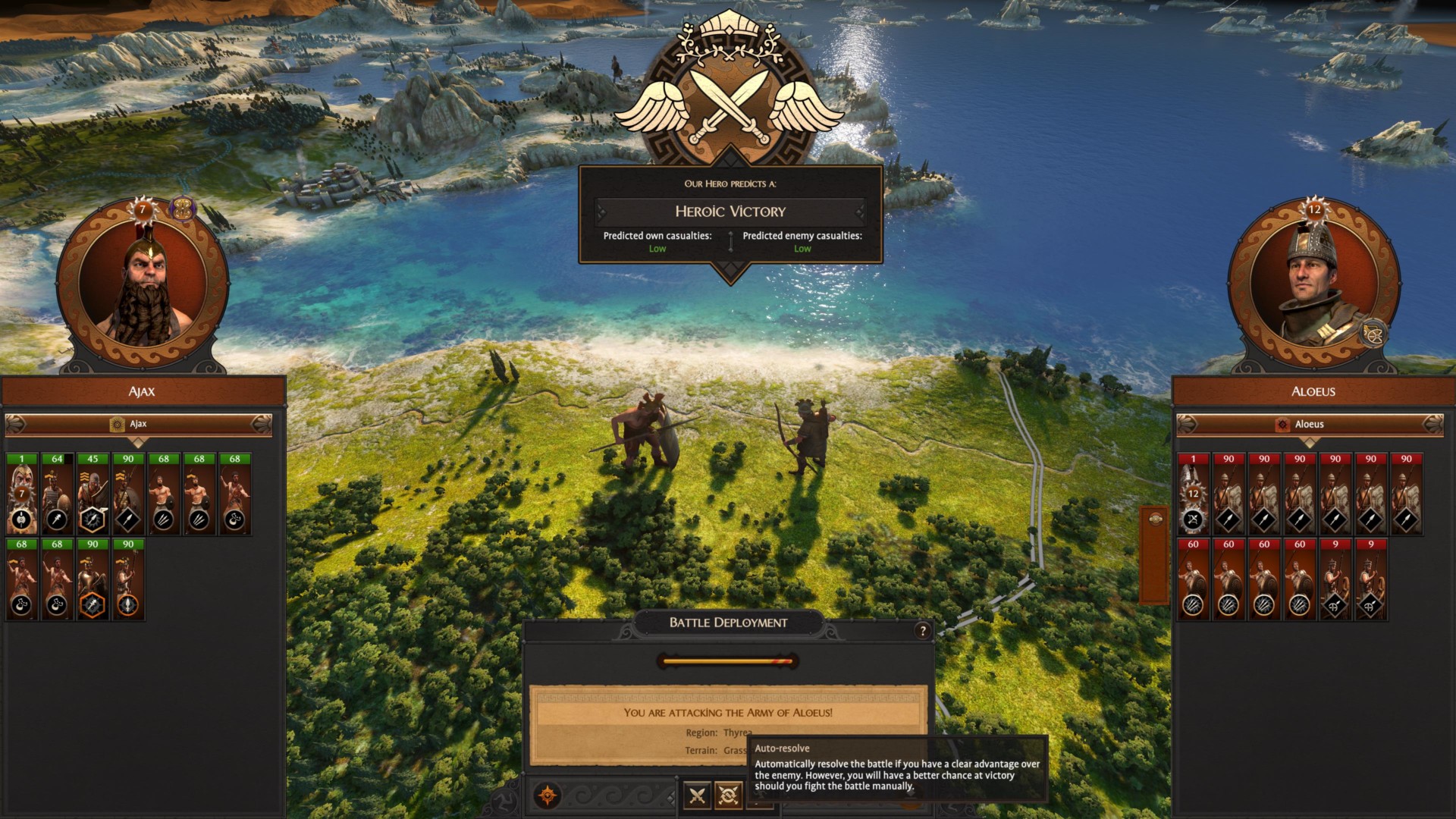 Note: As an added clarification, I’ve experienced an issue where Ajax lost units (and his army) after being defeated by a paragon general. It’s also why I’d advise simply auto-resolving. It’s possible to get easy decisive victories (or even heroic victories) as you can see in the next two images.