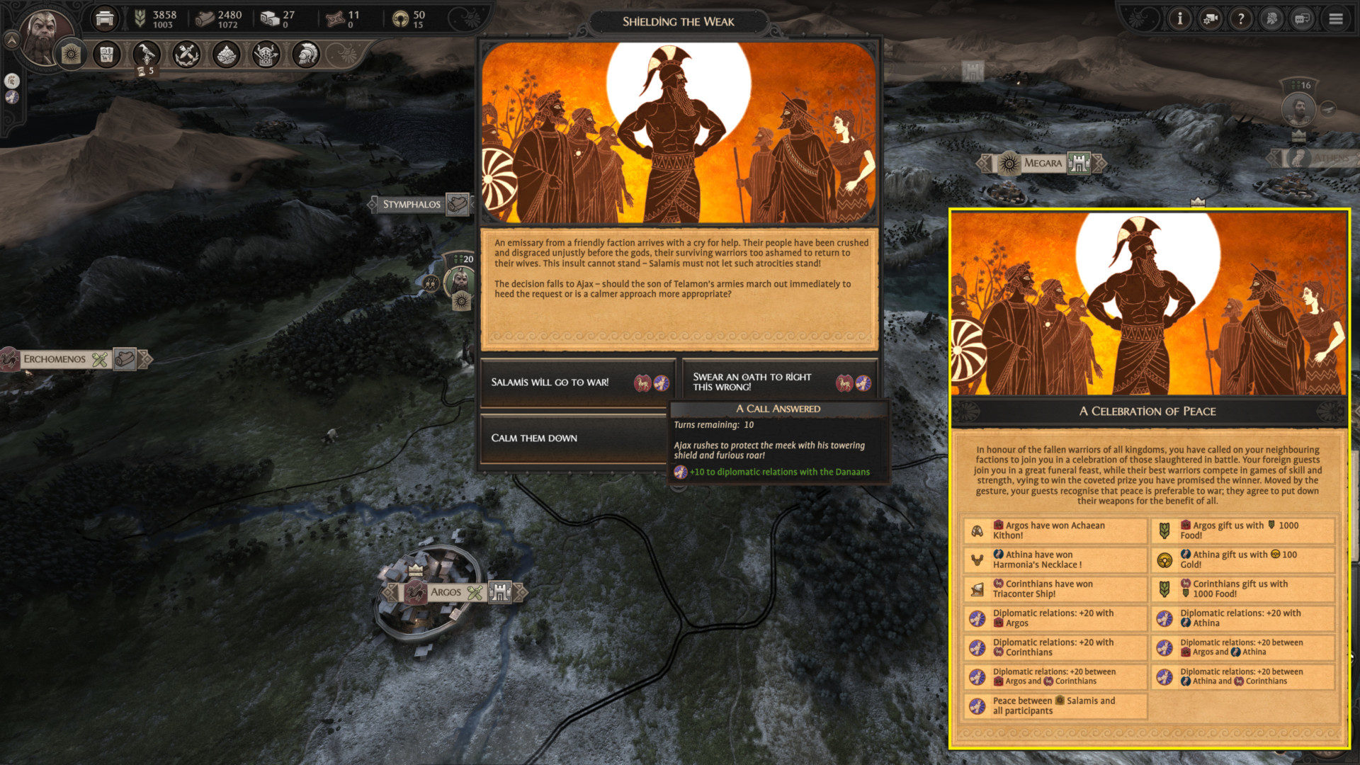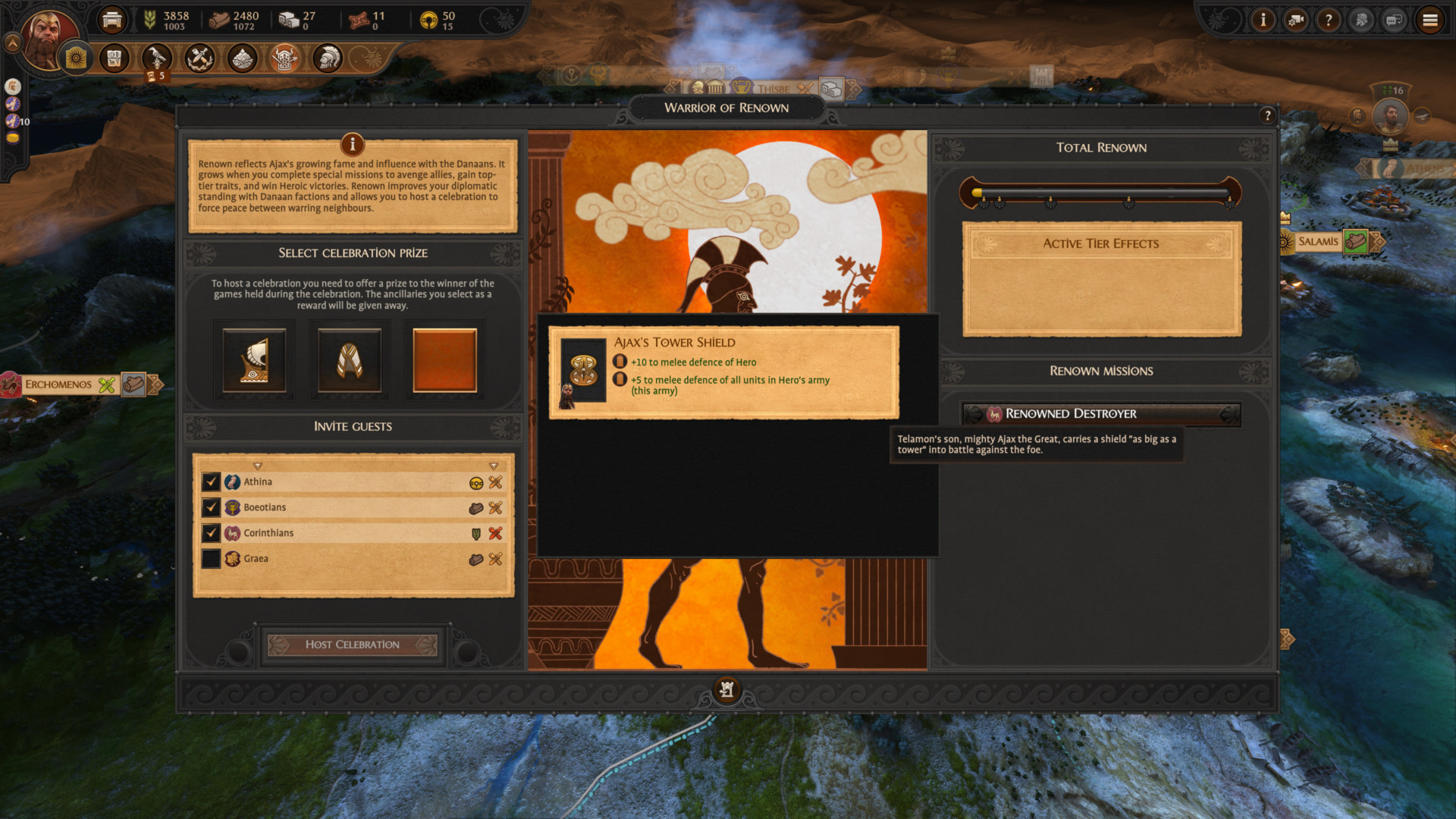 Speaking of renown, this “resource” is shared by Ajax’s unique mechanics (Warrior of Renown and Path to Greatness). A bar at the top of these panels shows Ajax’s renown level and thresholds. The higher the value, the higher the bonuses you’ll get when it comes to diplomatic relations with the Danaans and deal evaluations (except for barters).
