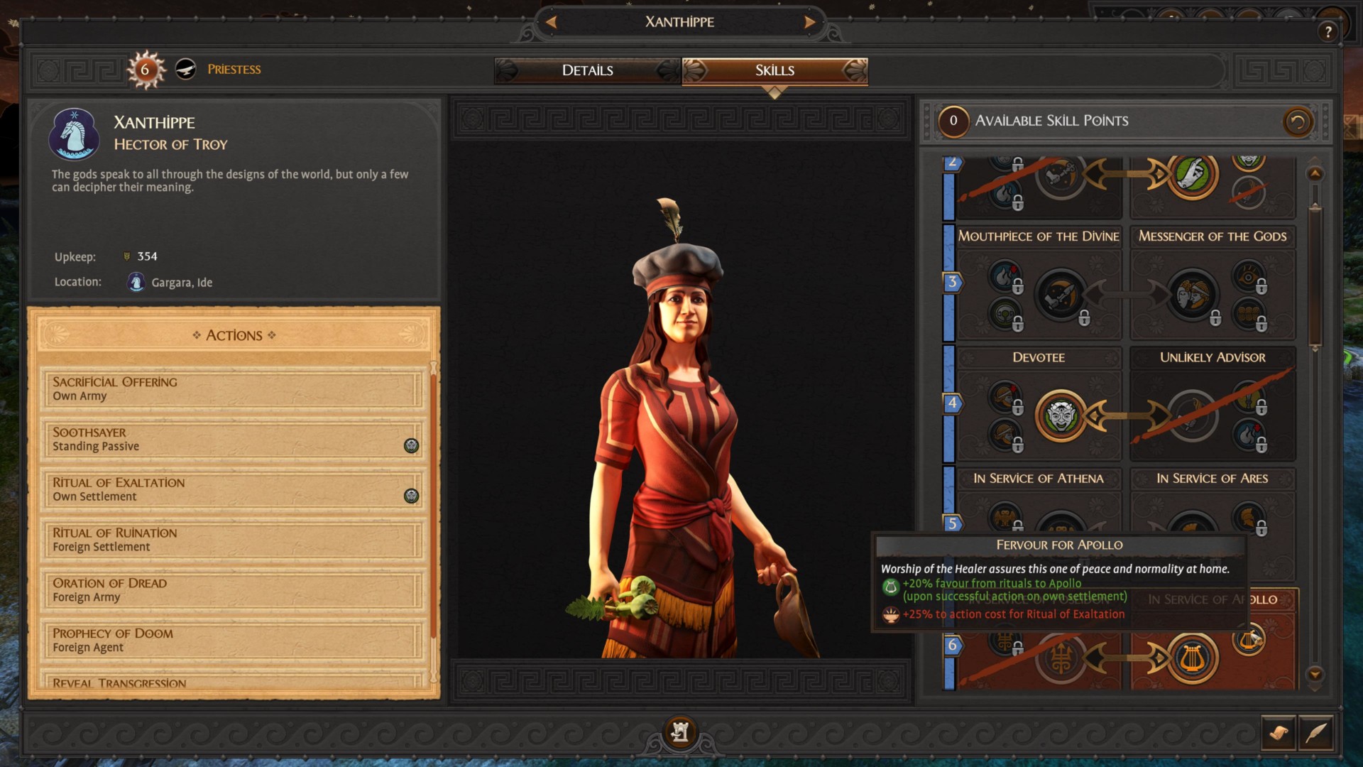 The image above shows the Warlord – Commander’s “Inspirational Leader” perk at level 5. You probably noticed that there are two main selections for each level (some have smaller nodes too). Well, in Total War Saga: Troy, picking a perk or skill for that level automatically locks out its counterpart. If there are two extra nodes (providing additional boons), then you can choose only one as well. As such, it’s important to take note of a “build” that you’d like to end up with. Oh, and this system also comes into play for your regular agents like the spy, priestess, and envoy.