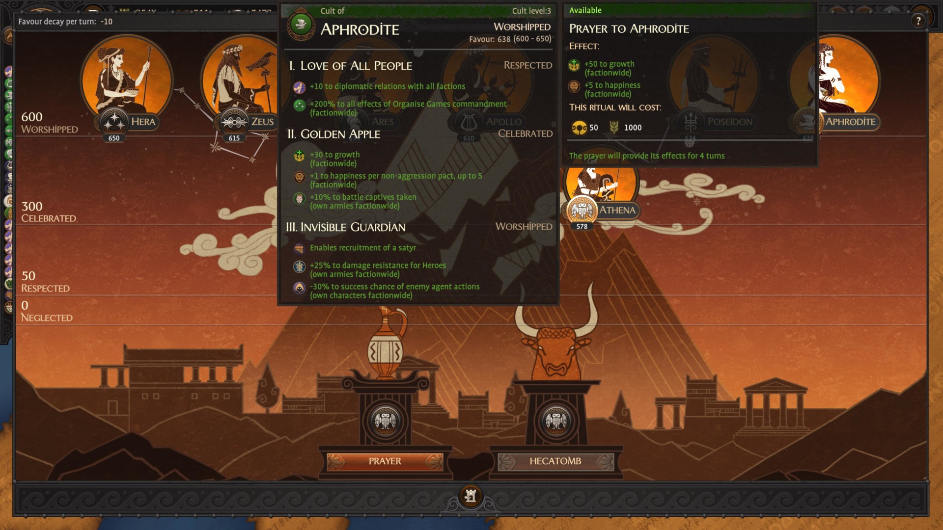 For instance, I usually pop a hecatomb and a prayer to Athena during the first turn. This will boost her cult to the next tier and, on my next turn, I’ll get additional recruitment slots and higher-ranked troops.