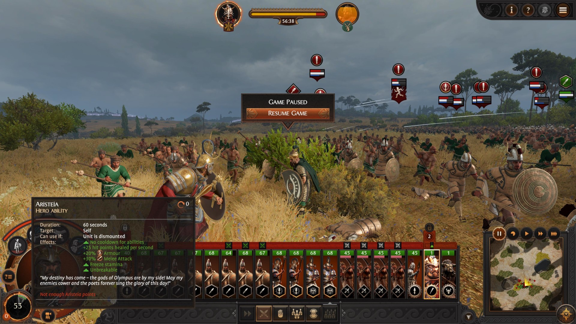 In Total War Saga: Troy, Aristeia acts like a “super” of sorts that can be used once per battle. You can see the effects of Agamemnon’s Aristeia in the image above.