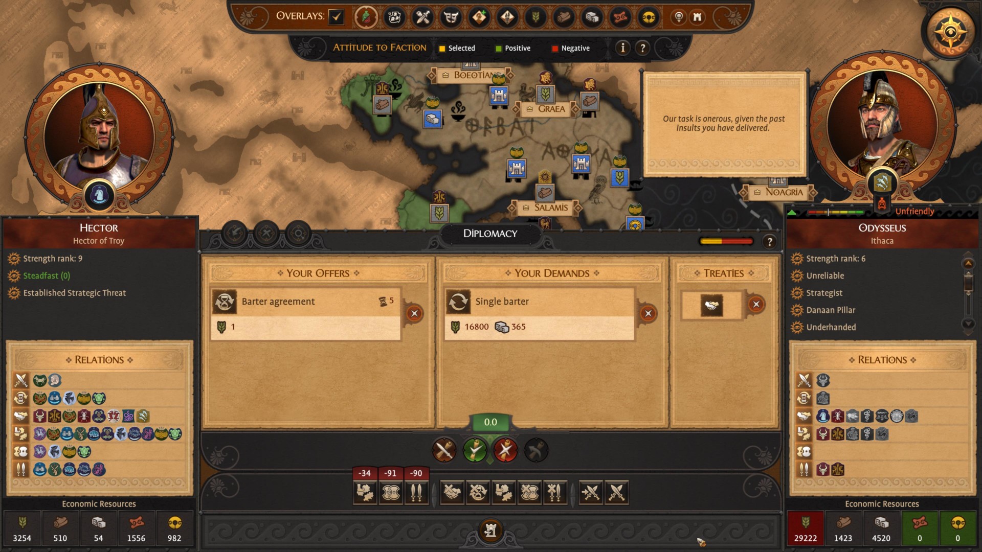 Much like Total War: Three Kingdoms, Troy also uses a barter system letting you exchange multiple types of resources (either a specific amount in one go or per turn). You’ll use these resources as leverage for diplomatic deals (ie, non-aggression pacts, alliances, peace deals, vassalization, and even obtaining adjacent settlements). It’s possible to have multiple barter deals exchanging the same resource too.