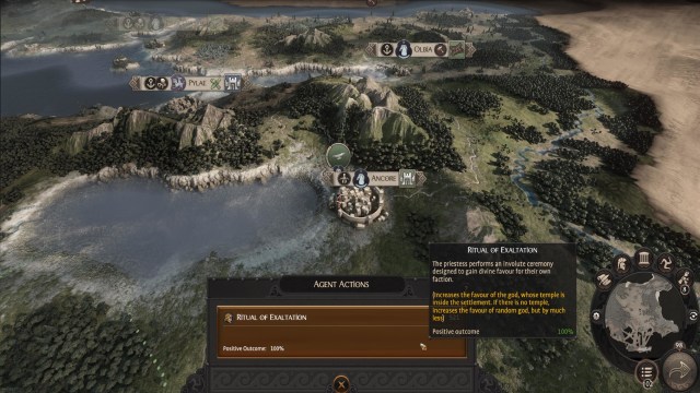 Remember that the “Ritual of Exultation” can only be done every four turns, so you’ll want to time it right with other means to maximize your favor gains. Since you can only field a maximum of three priestesses faction-wide, you should have specific agents that are predominantly focused on a specific deity while you’re spending resources on hecatombs and temples for other gods.