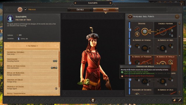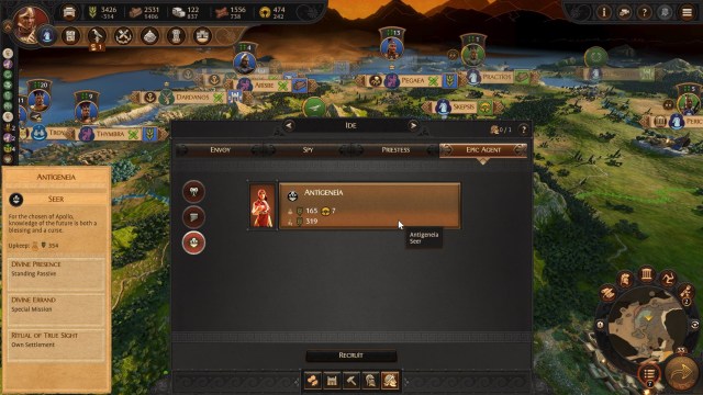 - Once the Cult of Apollo reaches the “Worshipped” tier, you can recruit the seer (epic agent) every 10 turns in any settlement. The seer instantly maxes out the cult level of a deity if she enacts a ritual in a settlement’s temple. She’s basically the Bronze Age’s version of a popular influencer, minus the “will tell my followers about your restaurant if you let me eat for free” schtick.