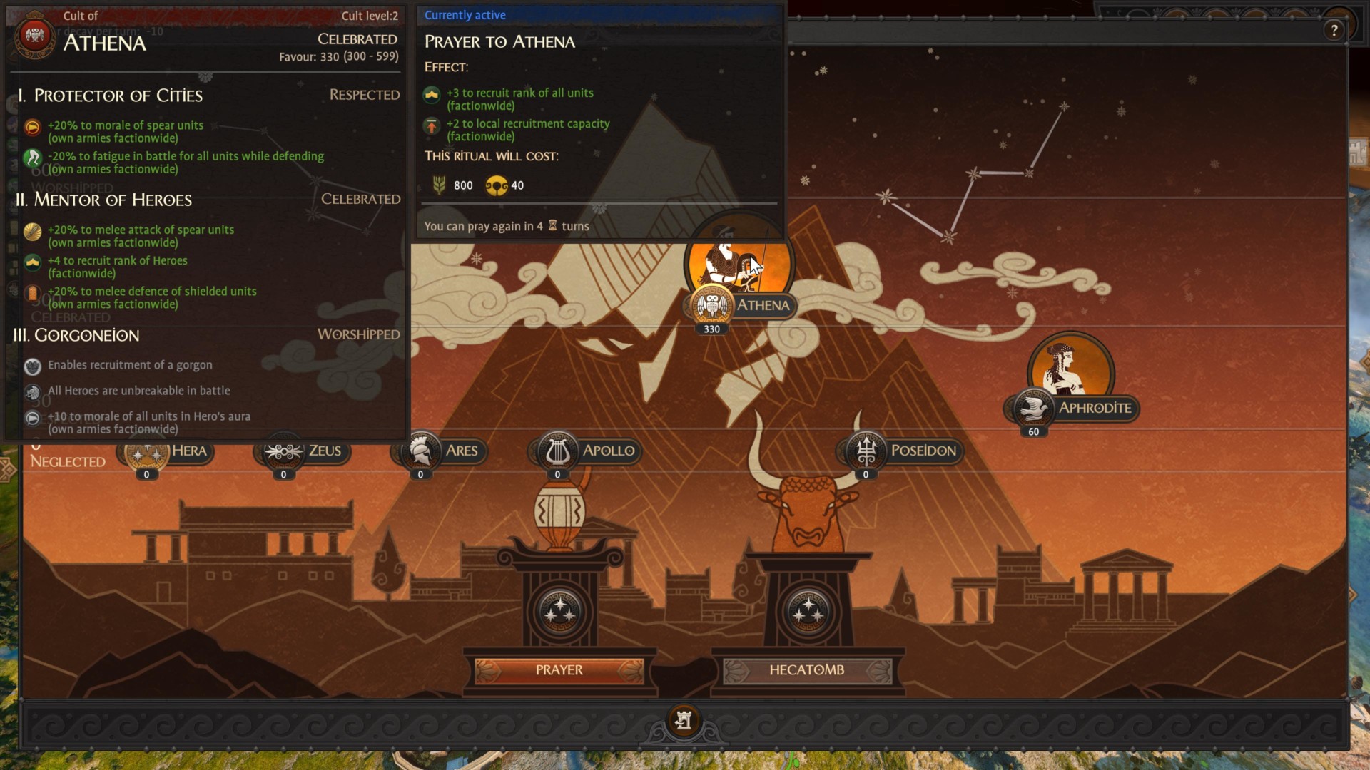 | Ares | Eager to Fight: +1 local recruitment capacity +20% morale for sword and axe units | Delight for Violence: +20% income from raiding, looting, and sacking +1 happiness for each war (up to +5) +20% melee attack for sword and axe units | Panic and Terror +10 charge for all units All heroes frighten enemies in battle Recruit Spartoi |