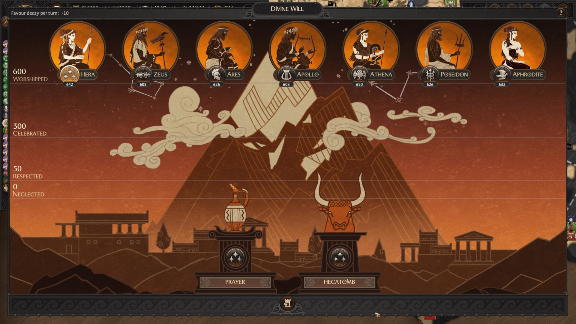 Having multiple tier 3/”Worshiped” bonuses provided by the gods and goddesses sounds awesome, right? Sadly, you also lose 10 favor each turn for all gods and goddesses until you’re back down to zero. Our goal to master the Divine Will mechanic, therefore, is to boost our favor gains to reach some semblance of stability when it comes to a particular god.