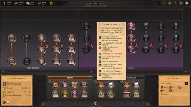 | Apollo | Piety: +3 recruit rank for priestesses -20% construction costs for temple buildings | Lord of the Silver Bow: +20% range for archer units +15% reload skill for missile units | The Light of Phobus: -20% action costs for all agents +25% administration efficacy for Royal Decrees/techs Recruit Seer |