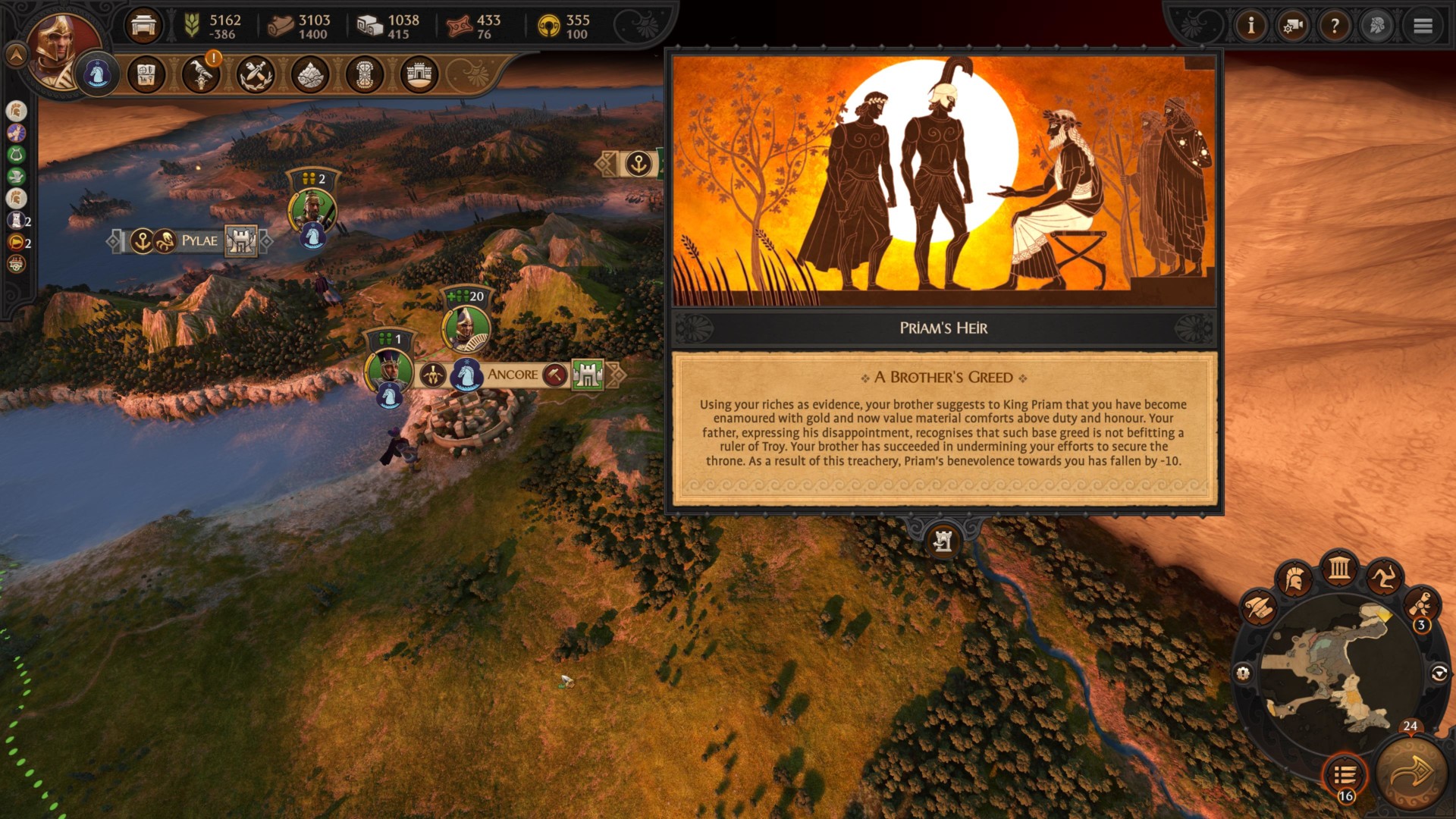 The Priam’s Heir mechanic is one of the coolest features not just in Total War Saga: Troy, but also in the entire Creative Assembly Total War portfolio. You can complete certain tasks or tallies to increase your “benevolence” in Priam’s eyes — let’s just call these “Priam Points.” You’re racing against Orlando Bloom who’s also completing some requirements and earning Priam Points.