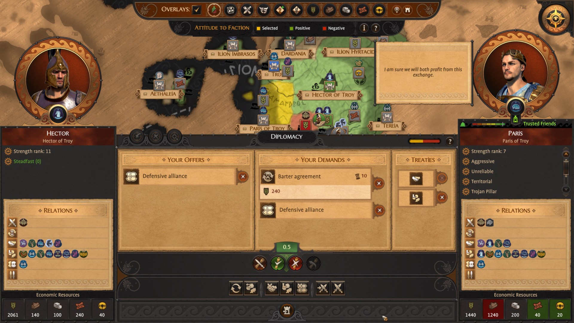 As soon as you start your Total War Saga: Troy campaign as Hector, go ahead and propose defensive alliances with Paris, Aeneas, and Sarpedon. You’ll have a positive diplomatic evaluation so you can milk them for all they’re worth via barter deals. You can also barter (or gift) Ilion Imbrasos and Ilion Hyrtacidae to nudge them closer to a defensive alliance.