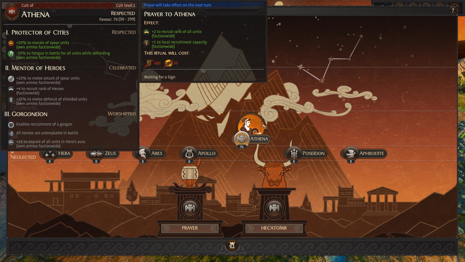 Once you’ve defeated Makaria’s army and captured the nearby settlement, initiate a hecatomb sacrifice for Athena to level-up her cult ranking. Then, pray to her to get promoted units and an extra recruitment slot next turn.