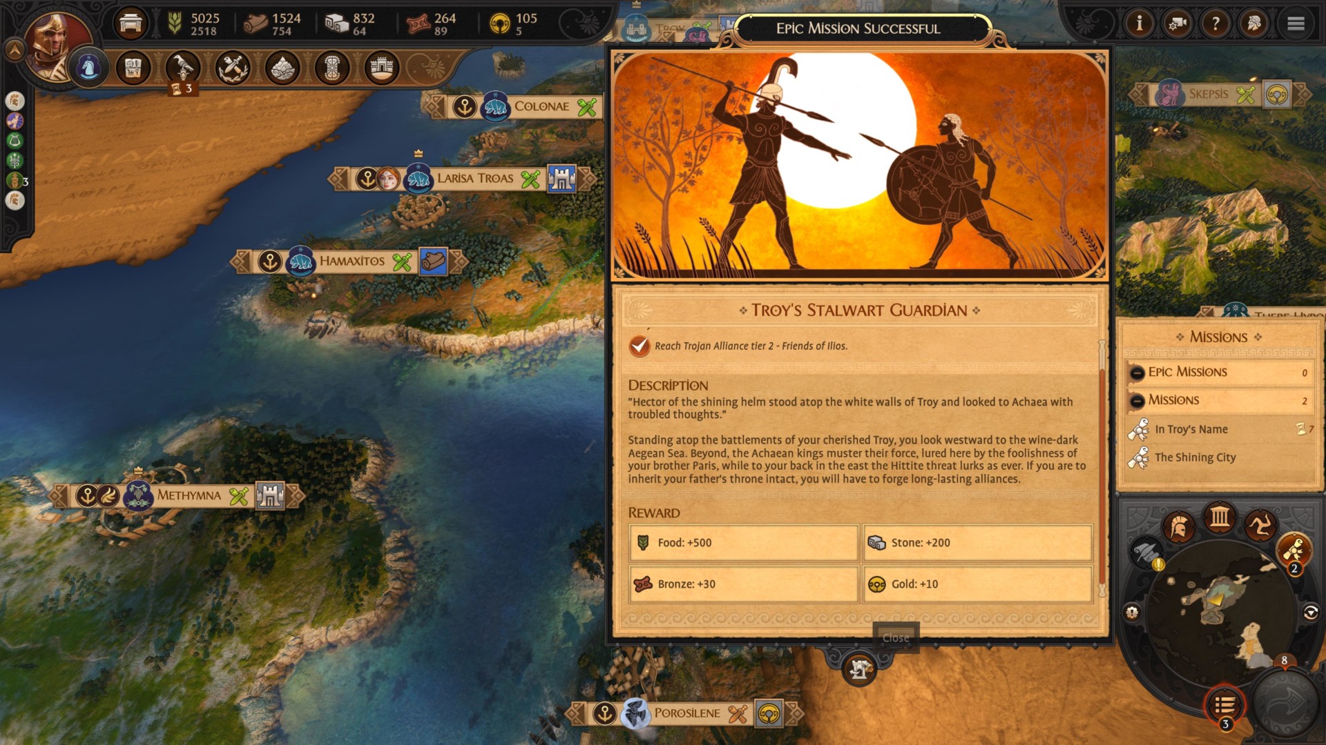 | The Shields of Phrygia | Control Adrastea province. | I’m not sure when this epic mission is issued for you, but in my case it was on turn 16 (several turns after completing Troy’s Stalwart Guardian). |