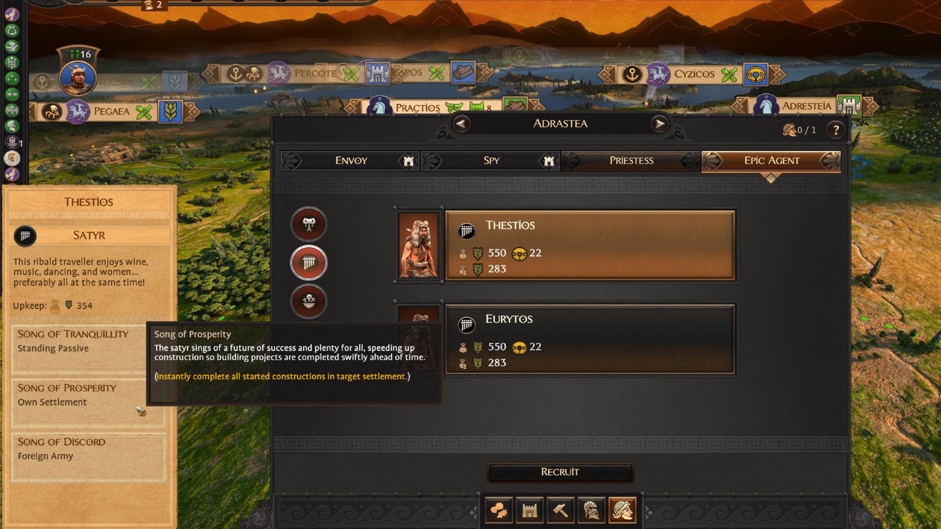 | Satyr | Aphrodite | Song of Tranquility: Increases growth and happiness in the local province. | Song of Prosperity (owned settlement): Complete all building constructions in a settlement. | Song of Discord (foreign army): Reduces army morale. |
