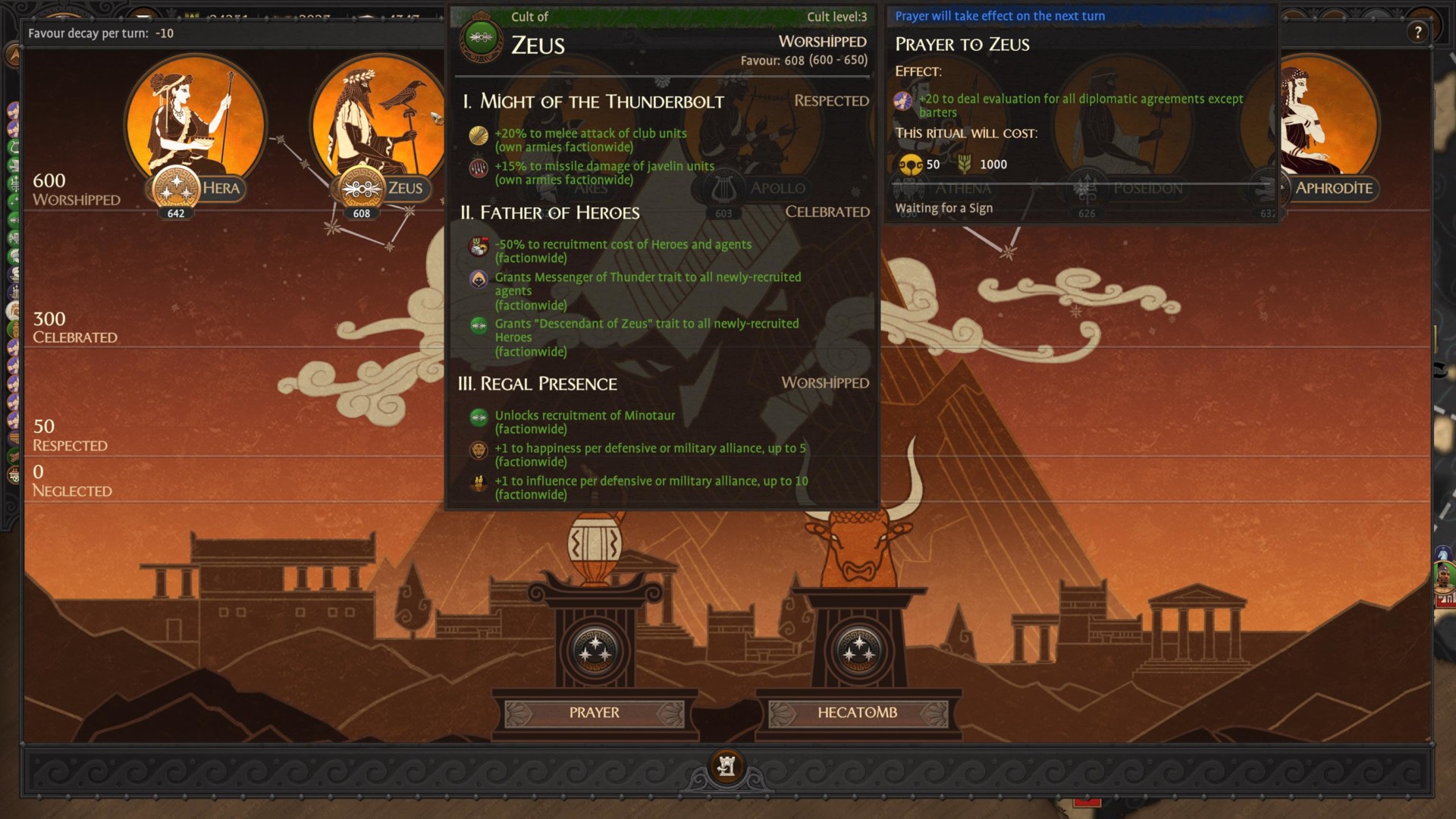 (2) Reaching the maximum cult tier (Worshipped) for a particular god or goddess via the Divine Will mechanic unlocks the recruitment of a specific mythological creature. They can be recruited in any settlement (epic agents) or by any army (combat units). For the latter, the number of recruits is still limited by the settlements you own.