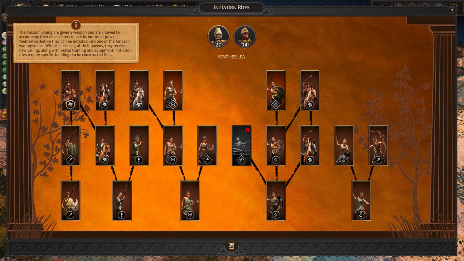 This would be the part where I discuss the military building chains for Penthesilea’s Amazons. Due to the Initiation Rites mechanic, the Amazon faction leaders can only recruit tier 1 units (i.e., Warbands, Amazon Chargers, Stoneslingers, and the like).