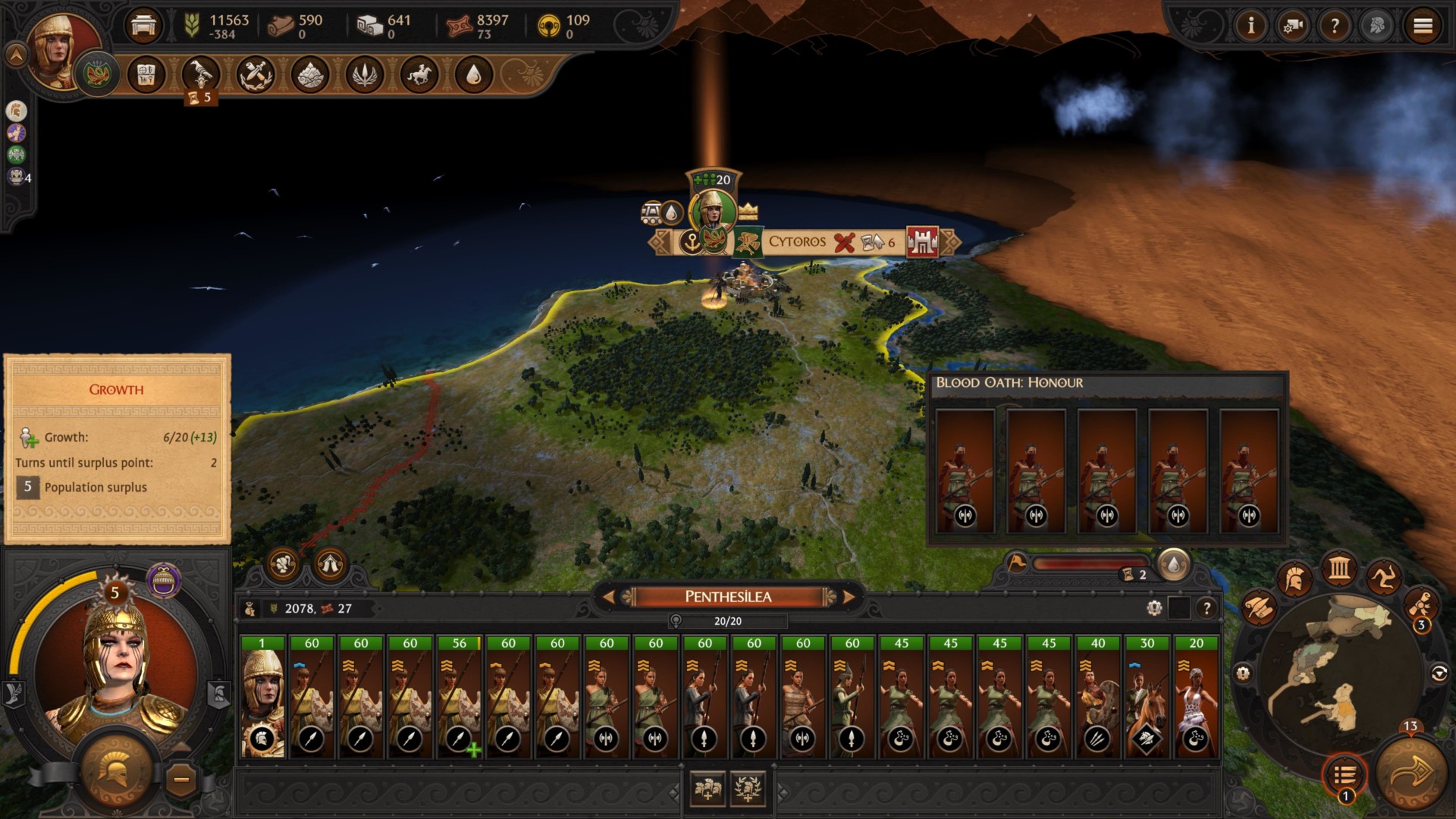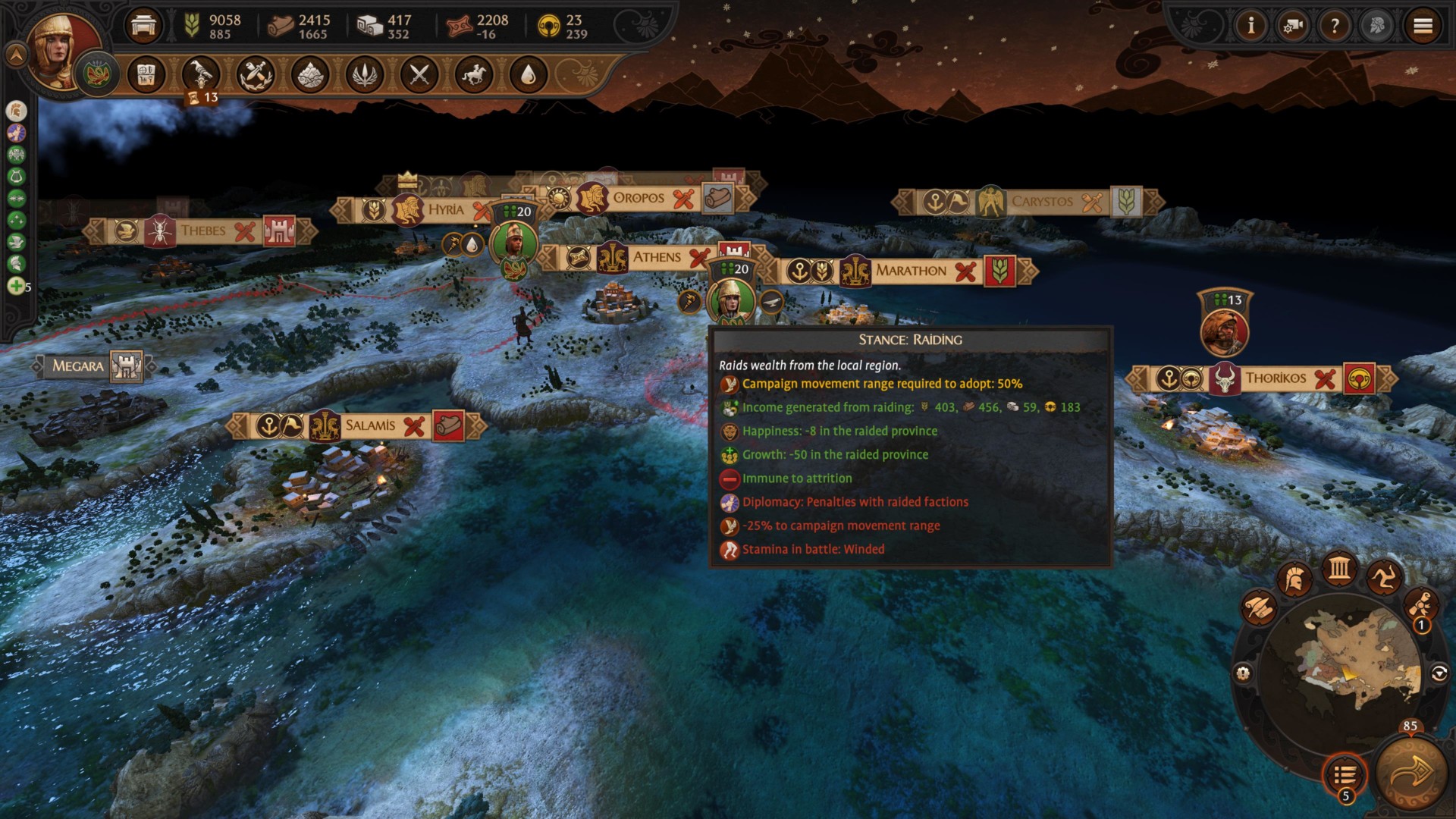 As for stances, you should be raiding wherever you go. Of course, don’t forget the encamp stance too so you could recruit your units. Penthesilea’s armies can activate this even when out of movement points, and you’d be able to add more troops even in hostile territory. Anyway, you can see below how much I’m gaining while Penthesilea’s in raiding stance in the heart of Greece: