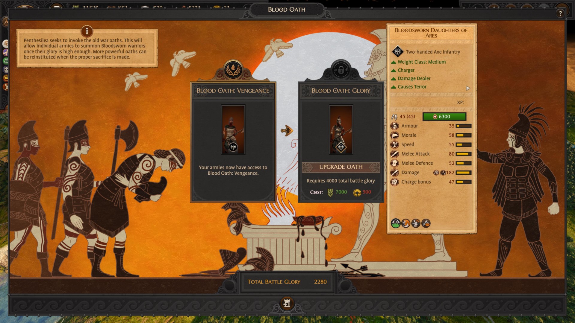 These two mechanics make Penthesilea’s Amazons faction a powerhouse in Total War Saga: Troy. Firstly Battle Glory is gained whenever you kill captives, raze settlements, or activate encamp stance. The goal here is to continue amassing this resource and pass thresholds that unlock Bloodsworn units.