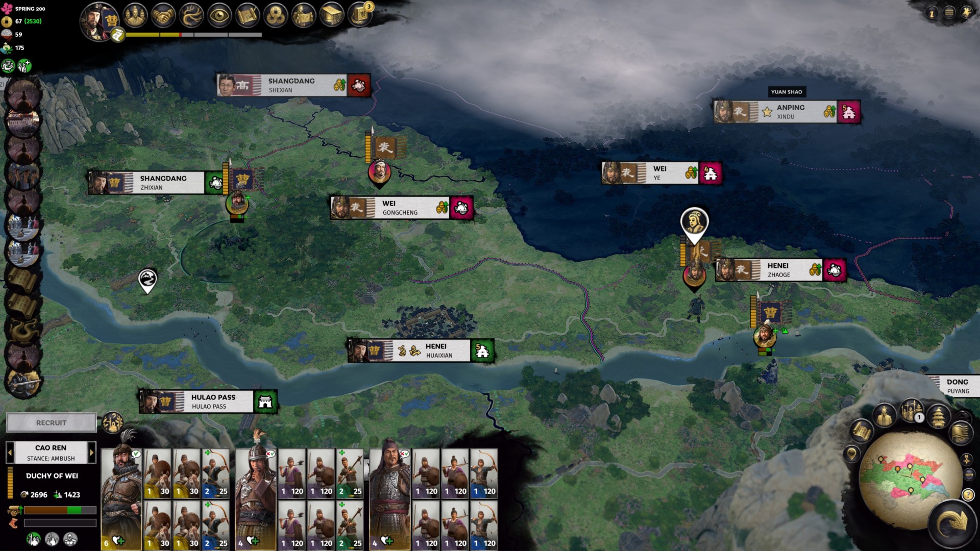 - Xiahou Yuan’s army – You’ve only got Xiahou Yuan here and he’s right next to Gong Du’s city in Runan. Add a second officer (i.e., Xun You) and give him Archers. If you still have extra gold, add a third (i.e., Han Hao) and give him some Ji Militia. Xiahou Yuan’s army should simply stay in ambush stance since Gong Du will muster his forces faster than you.