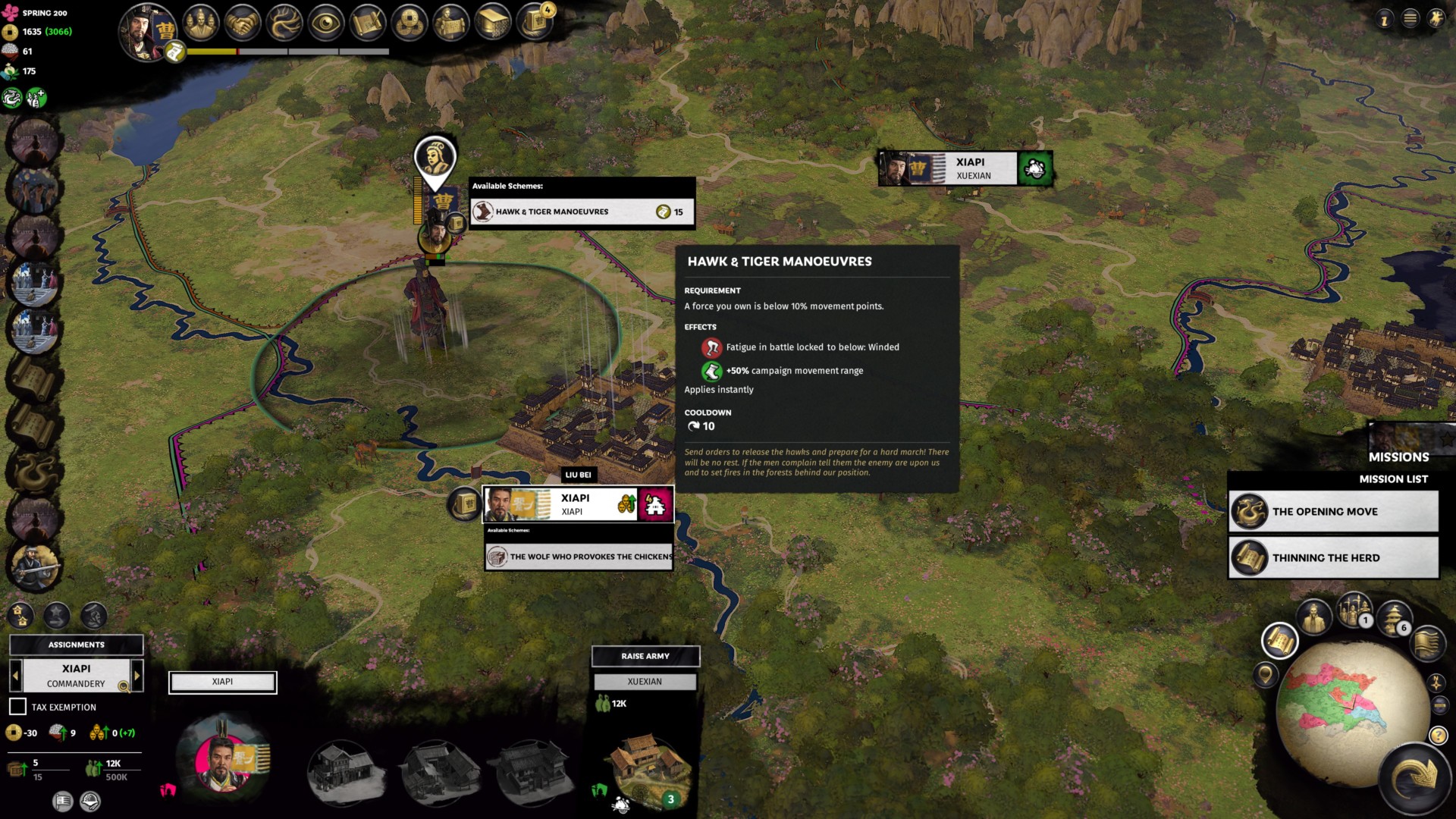 After recruiting Guan Yu, move Cao Cao closer to Xiapi. Cao Cao will run out of movement points, so open the Schemes panel and use “Hawk & Tiger Maneuvers.” You’ll regain some movement points, allowing you to attack Xiapi. Make sure you don’t lose a lot of troops here.