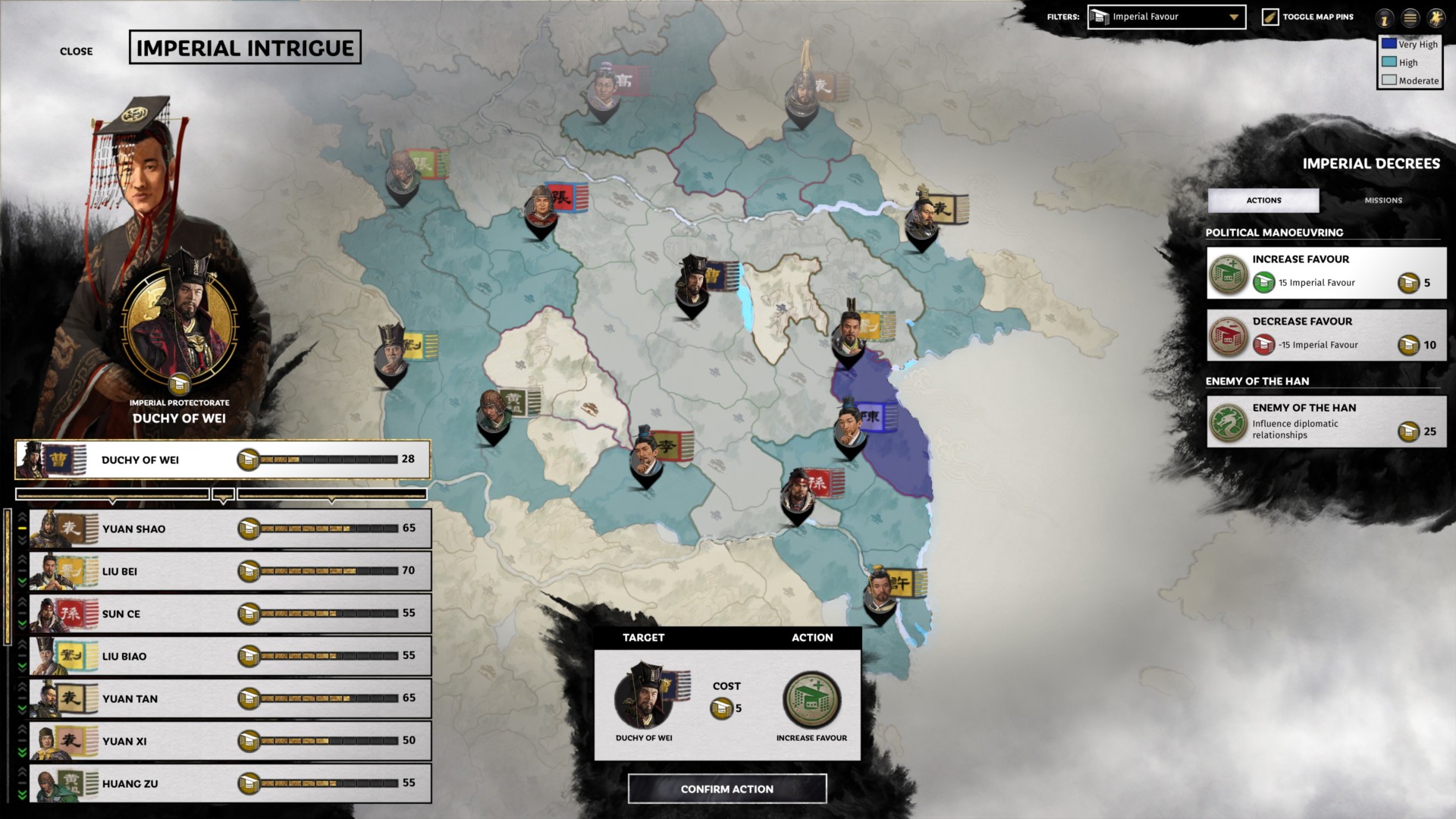 Speaking of Imperial Favor, check the Imperial Intrigue panel and take note of how many points Yuan Shao has. Just increase Cao Cao’s favor for now and go save your game.