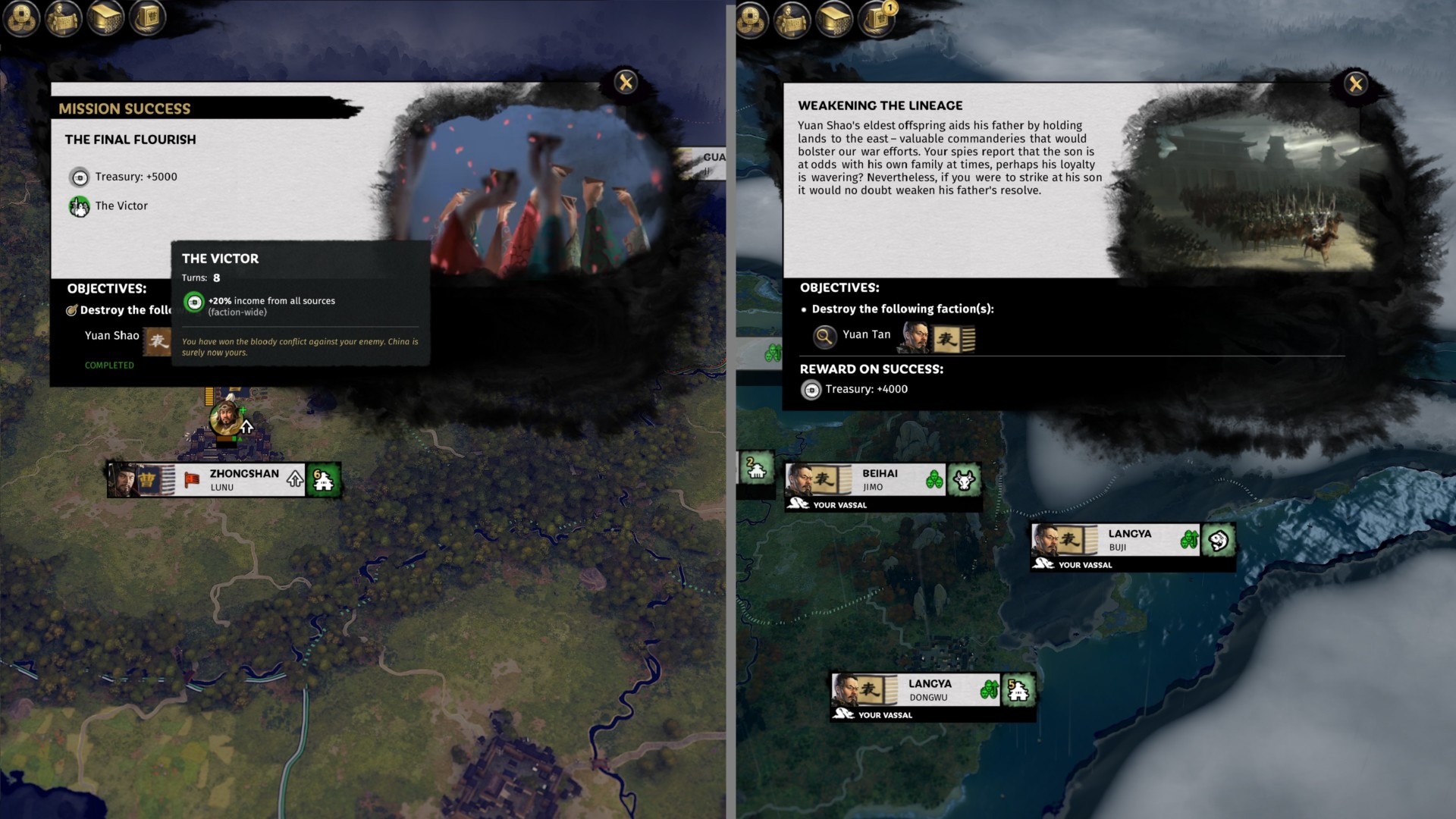 | The Final Flourish | Destroy Yuan Shao’s faction | +5,000 gold; +20% income from all sources (8 turns) |