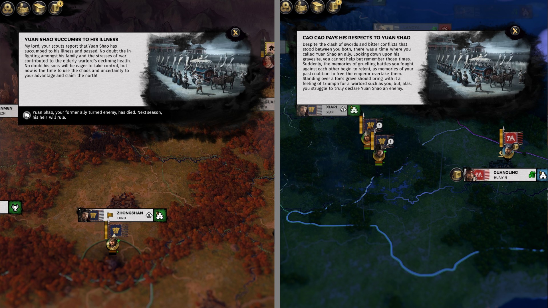 - “Yuan Shao Succumbs to his Illness” occurs in autumn 203 CE (turn 19). The event mentions that his sons will create chaos as they stake their claims. Surprisingly enough, I didn’t notice any Yuan family squabbles.