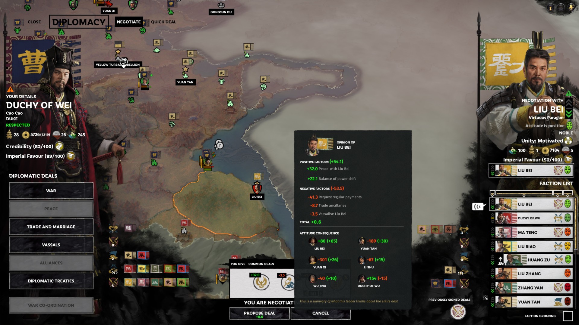 This allows you to enforce your peace demands on Liu Bei. You can even add Credibility and an Imperial Decree to the mix if you want to ensure vassalization. The same also goes for Yuan Tan, Yuan Xi, and Gao Gan if you want them to become your subjects.