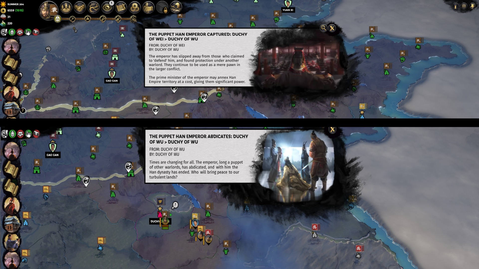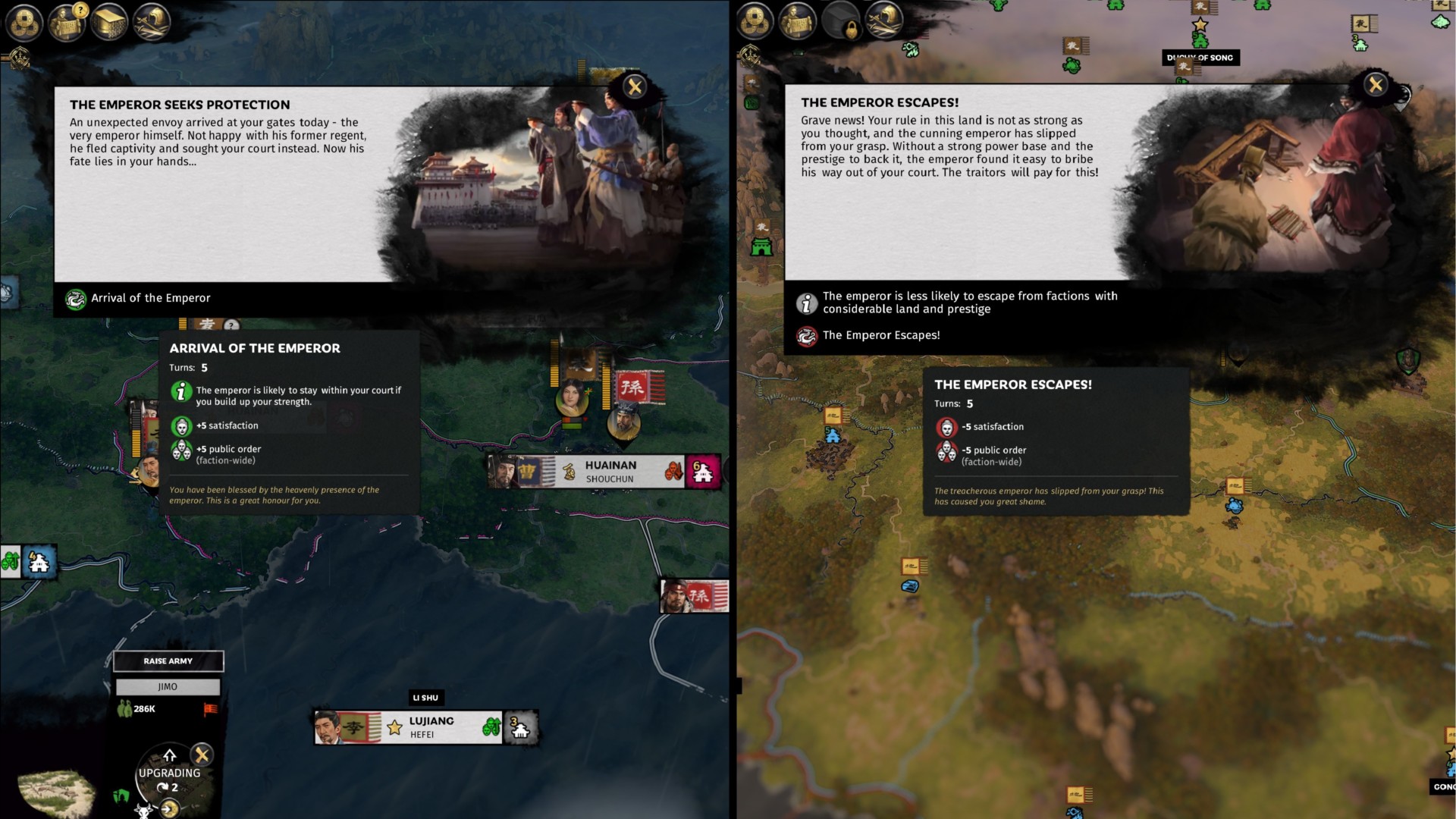 This is akin to what you’ve experienced if you’ve tried A World Betrayed before. But, I do believe that it’s exacerbated at any point past 197 CE since Imperial Favor values are also taken into consideration. Indeed, it’s possible to see notifications where Liu Xie escapes to one faction only to end up in another (or back to the same faction) within the same turn. I told you, it’s “hot potato” mode.