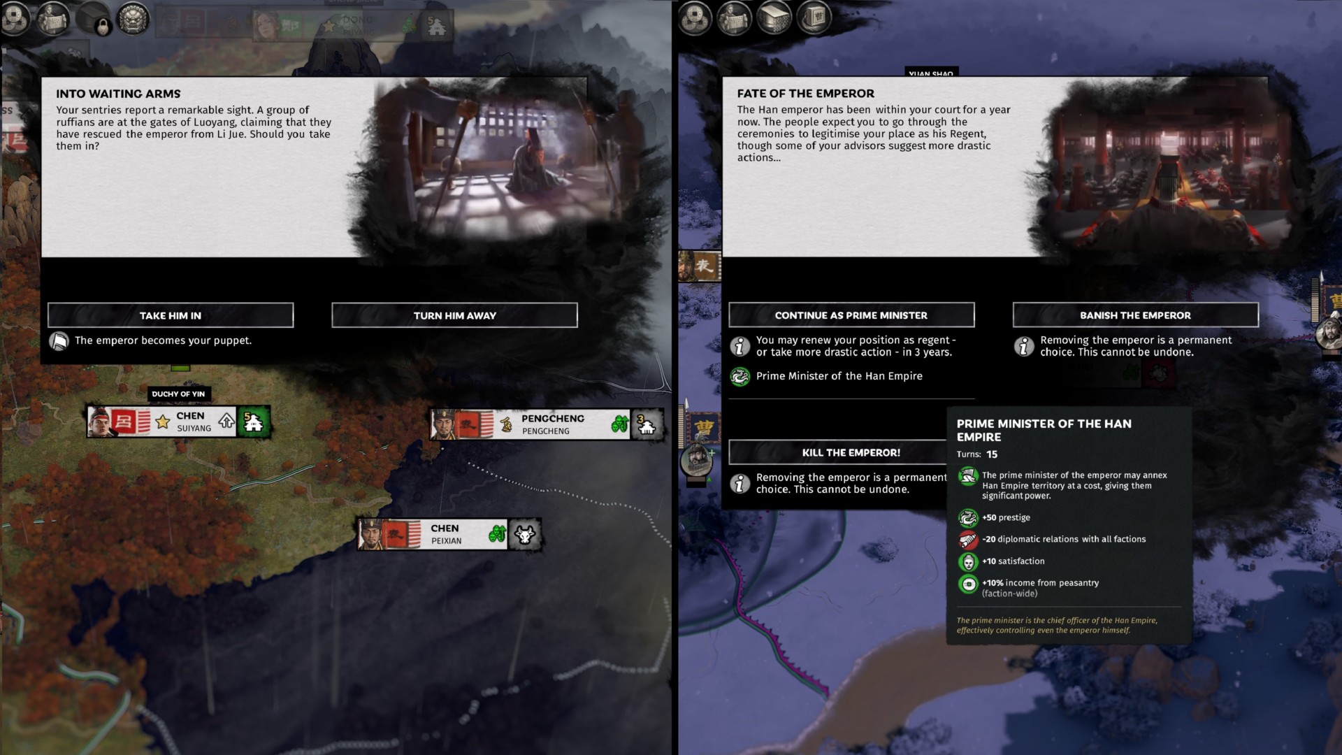 If your faction is able to control the Han Emperor for a full year, then you’re presented with a dilemma as to what to do with him. Simply put, do not banish or kill the Han Emperor.
