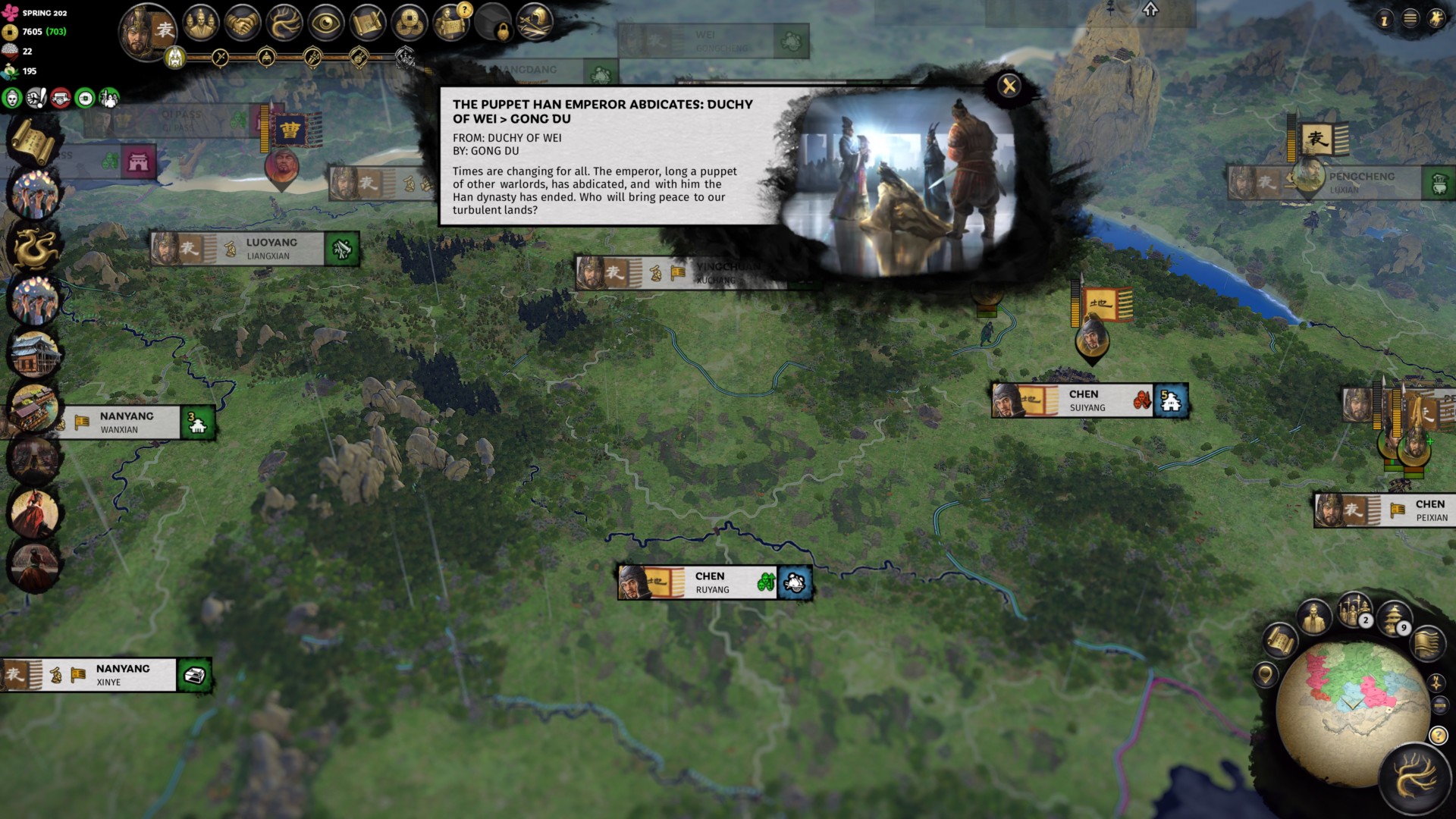 That’s definitely a bummer, especially if you want to roleplay as lowly Liu Bei or anyone with fewer owned settlements. To be fair, I’ve only seen AI Sun Ce cruising to create the Kingdom of Wu in the 200 CE start date. Alternatively, you can go with an earlier start date, though you have to manage the “hot potato” game often.