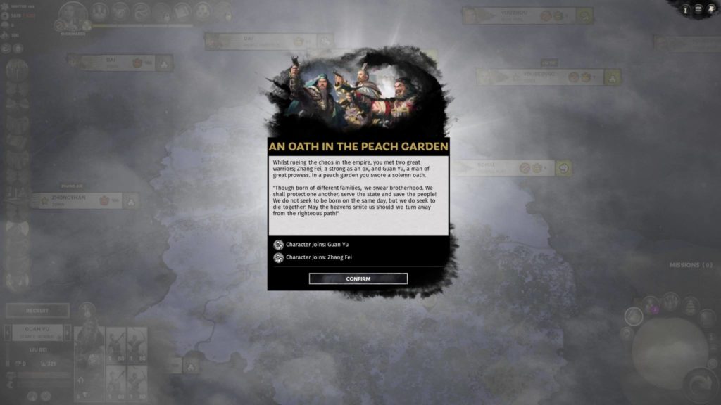 Note: There seems to be a bug with this event. Duplicates of Guan Yu and Zhang Fei can spawn once the “Oath in the Peach Garden” event fires.