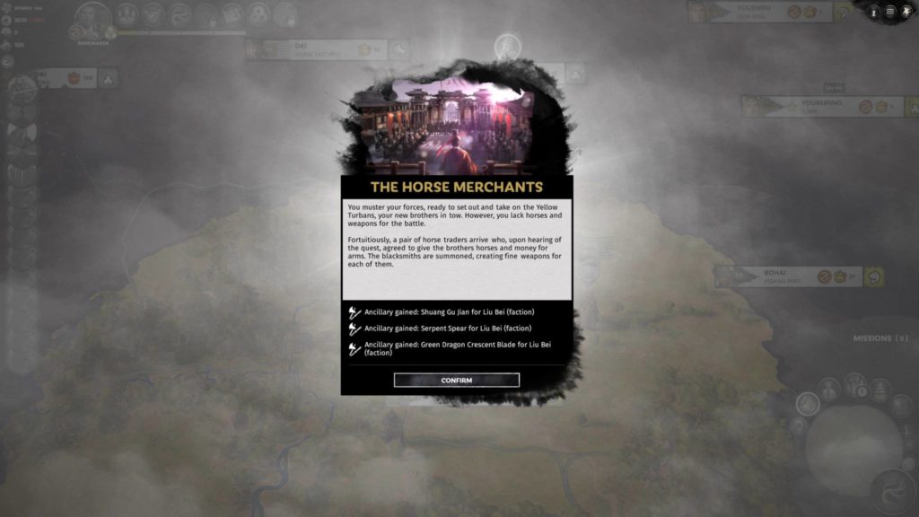 In Mandate of Heaven, old long ears starts alone near Pingyuan. He’s yet to meet his sworn brothers Guan Yu and Zhang Fei.