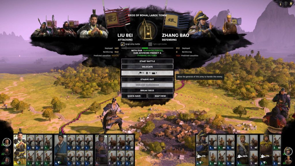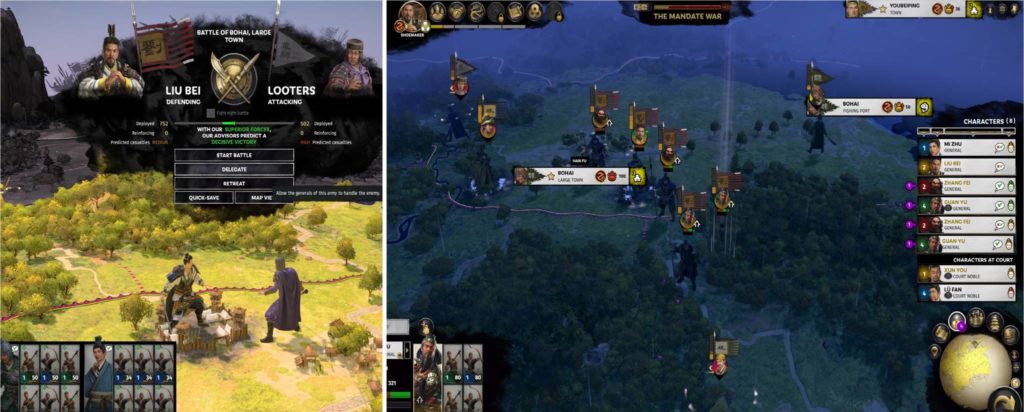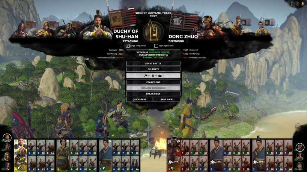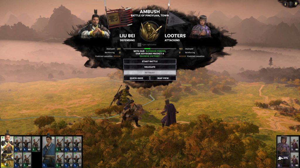 Liu Bei’s Mandate of Heaven campaign can be difficult because you have to ensure that you’re in the correct positions and stances each turn. Otherwise, the looter armies you encounter will end up running away, or they can attack you while your troops are weak (leading to restarts). You may have to manually fight each battle (especially on higher difficulties) to minimize casualties.