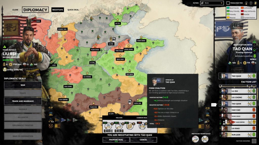 In Total War: Three Kingdoms‘ original campaign, Tao Qian’s death would lead to Liu Bei taking over his lands via a faction dilemma. Unfortunately, getting this dilemma to happen in Mandate of Heaven is almost impossible. In one playthrough, he died too early. In another, he stayed alive. But, I was in a coalition with Lu Zhi at the time and Tao Qian just wouldn’t accept. He joined an entirely different coalition instead.