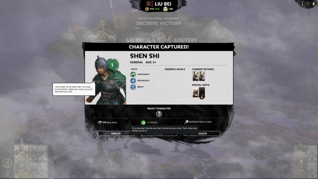 What needs to be mentioned is his 50% reduction to militia unit upkeep. Even though you start Mandate of Heaven‘s campaign with no land to call your own, you can still recruit officers and units. Combined with the aforementioned perk, it’s possible to have militia armies that have free upkeep — all you need to do is pay the gold required to deploy them (seen below). Do note that militias aren’t as effective nowadays compared to what you’re used to in Total War: Three Kingdoms, so you’ll probably want to recruit better units down the line or avoid auto-resolving most battles.