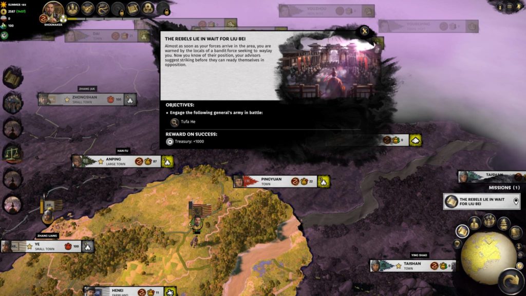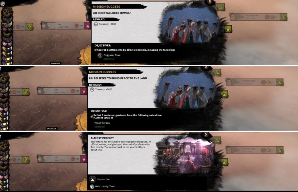 - Capture three settlements including Pingyuan – If you’re able to defeat Zhang Liang, then you should have Anping ready for the taking. Since the previous quest gave you have Pingyuan, you’ll complete the final requirement automatically. You’ll get the rank of noble, raising you from your humble beginnings as a sandal maker.