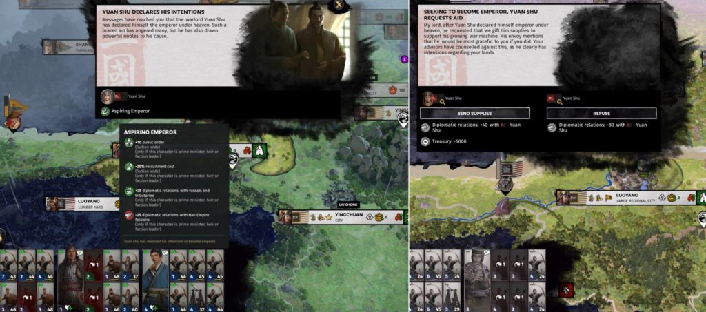 On turn 42, Yuan Shu will declare himself as emperor, earning him the enmity of the lords of the land. A couple of turns later, he’ll also ask you for support: