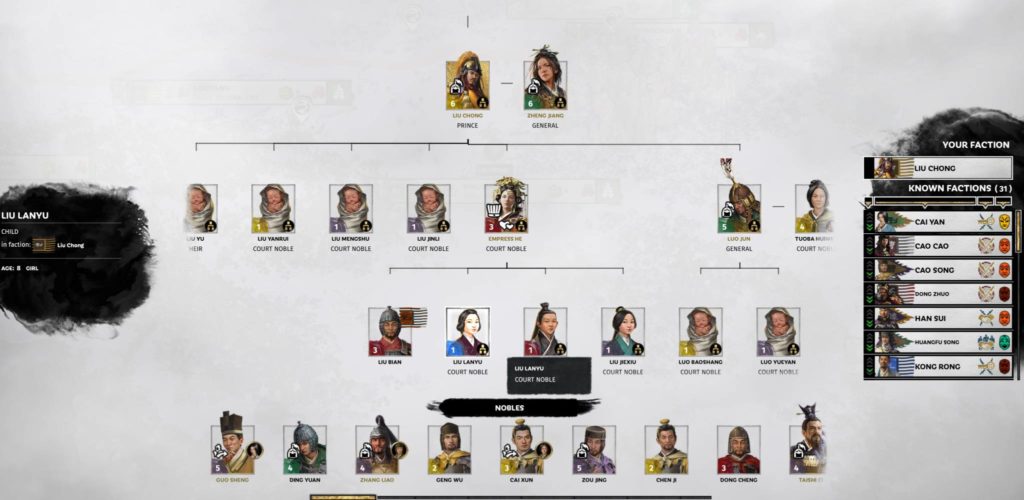 I eventually annexed Liu Bei’s faction and reached King rank. Liu Chong declared himself as the ruler of the “Kingdom of Chen” and not as a renewed Han Empire. Even though Mandate of Heaven groups him and Liu Hong as members of the “House of Han,” he doesn’t gain the same mechanics such as court factions or political influence.