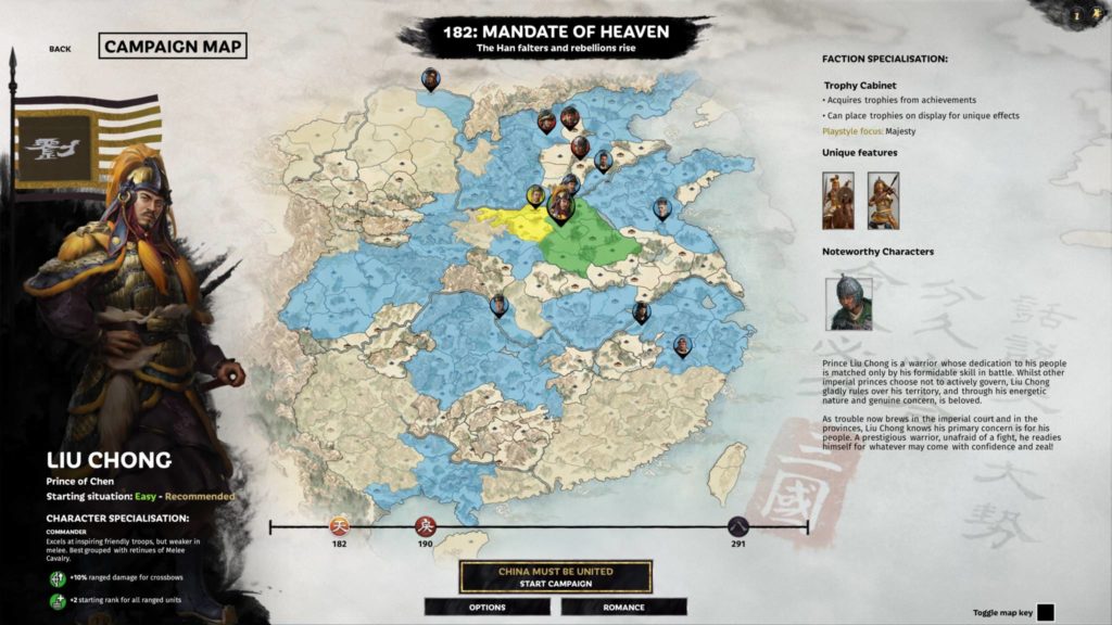 Total War: Three Kingdoms – Mandate of Heaven‘s leader selection screen will tell you that Liu Chong is an “easy/recommended” choice to start your campaign with. He’s extremely lethal due to all the crossbow and ranged unit buffs, although some of his mechanics are not well-suited for empire-building or resource-generation.