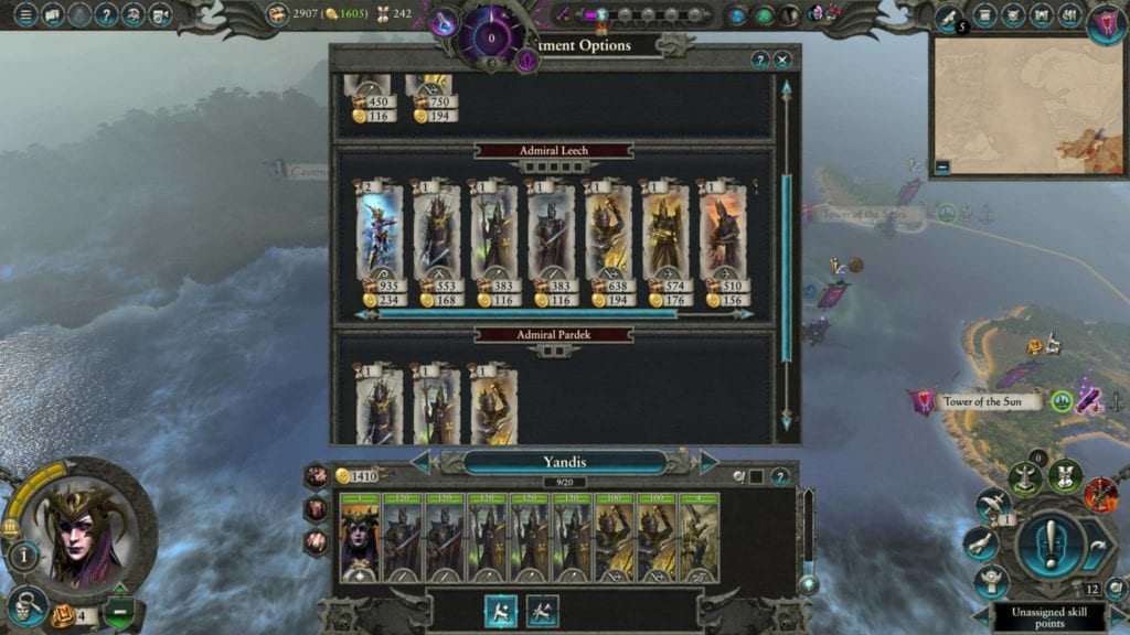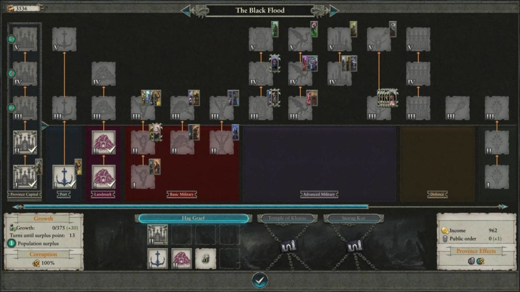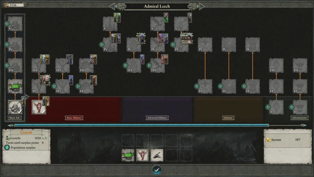 Black Arks/admirals function as a mobile base or horde army. Think of them as akin to the commanders of the Vampire Coast faction since they have their separate growth stats and building chains. Naturally, you’d want to focus first on buildings and techs that increase growth, allowing you to construct more add-ons to your vessels.