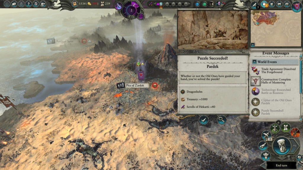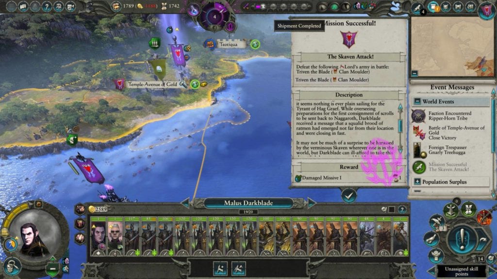 Note 2: Total War: Warhammer 2‘s Vortex campaign victory requires Malus to have 1,500 turns at the start of his turn. You’ll also need to complete the Rise of Darkness final battle. The Scrolls of Hekarti mechanic is not present in Mortal Empires, and you’re mostly out there to conquer warlords in the Southlands.