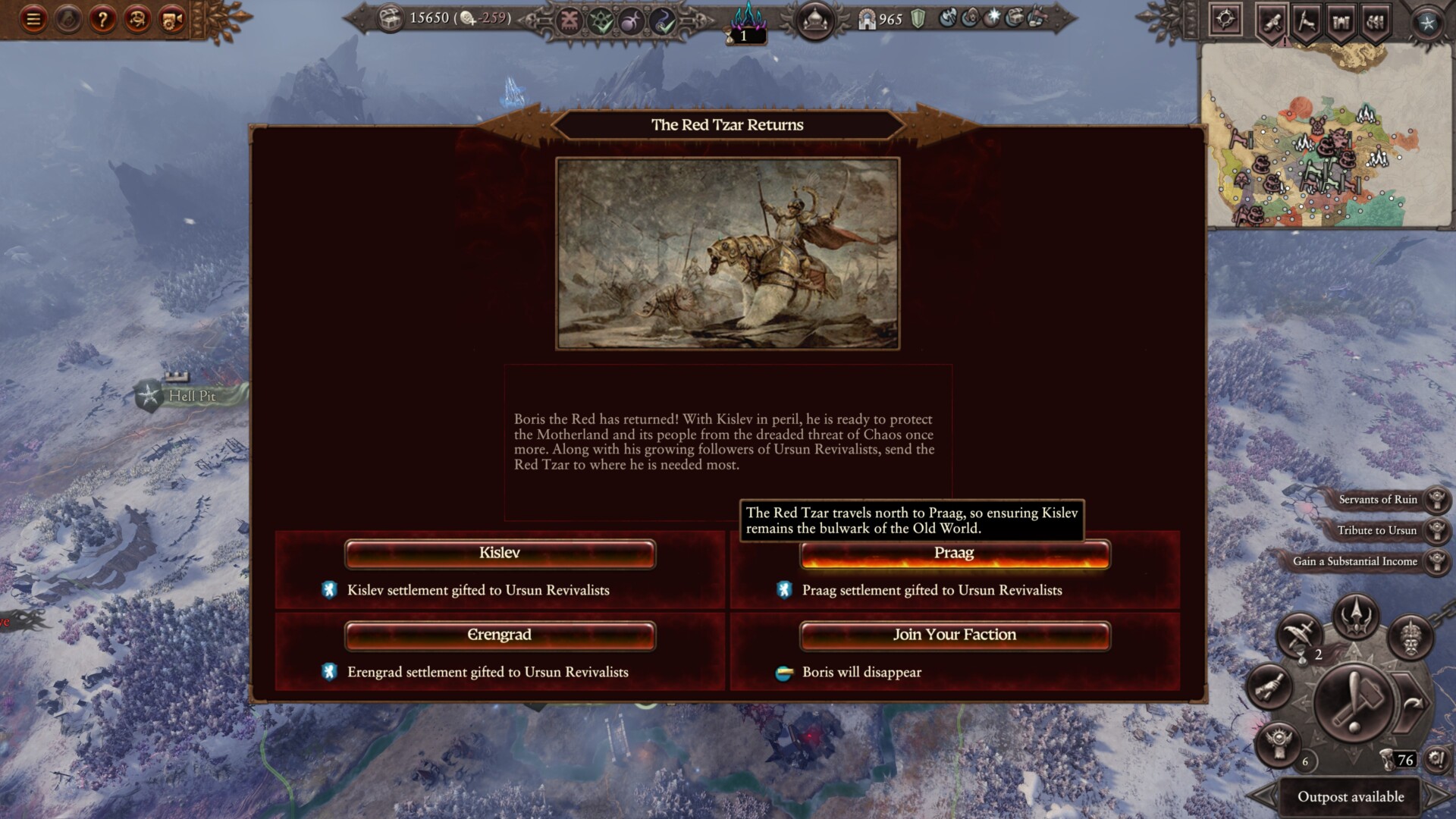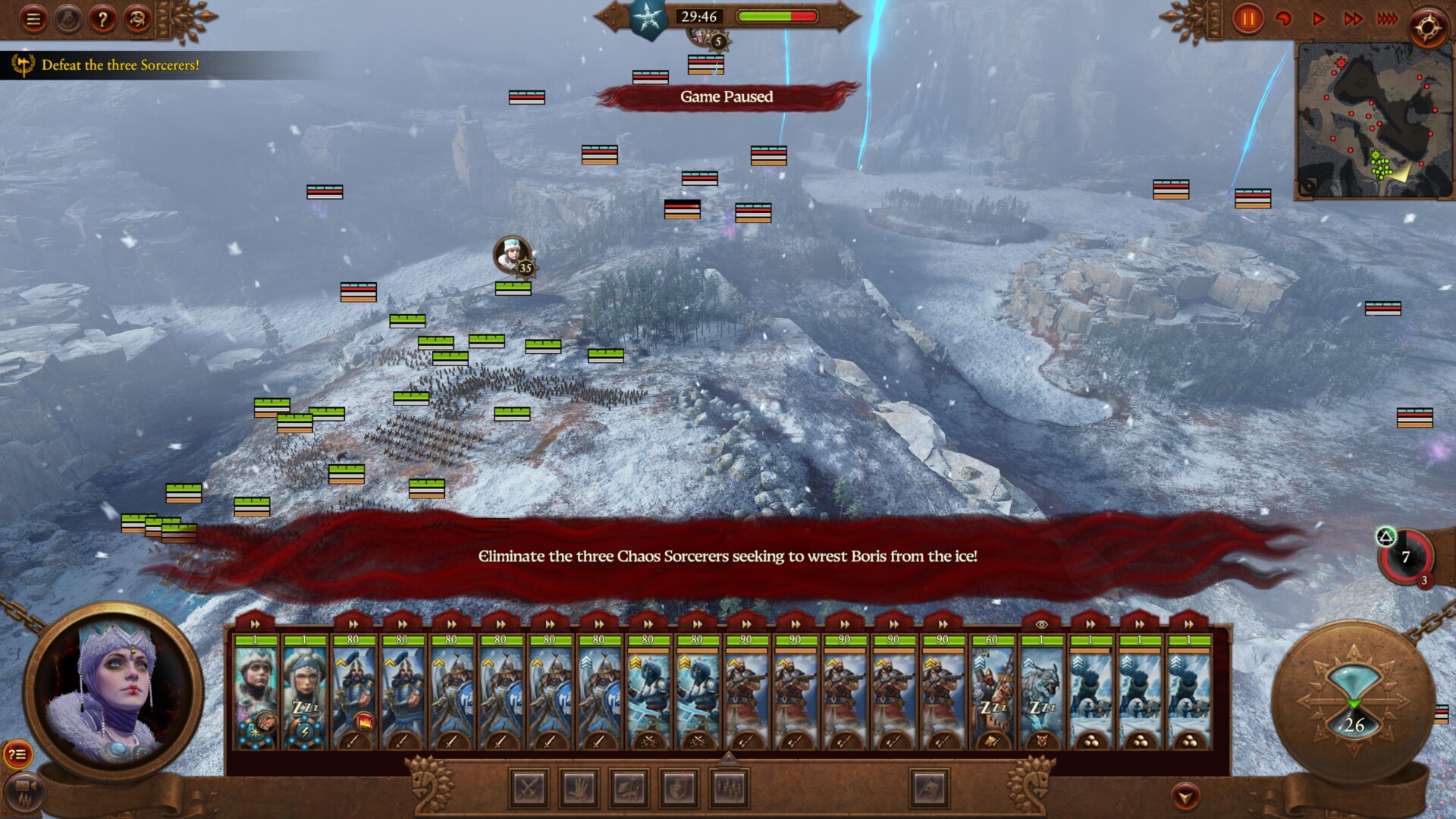 Boris Ursus was presumed dead at the start of Total War: Warhammer III‘s campaign. But, he’s actually just sleeping on the job. If you play as either Tzarina Katarin or Kostaltyn, you’ll need to control the three great cities of Kislev, Praag, and Erengrad for 10 consecutive turns. If you manage to do this, a quest battle called The Frozen Falls will appear. You can teleport to it anytime when you’re ready.