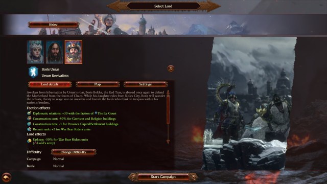 Now, you can select Boris Ursus as one of Kislev’s leaders in custom battles, as well as a starting lord in Total War: Warhammer III‘s campaign. He leads the Ursun Revivalists faction, and he’s got the following bonuses: