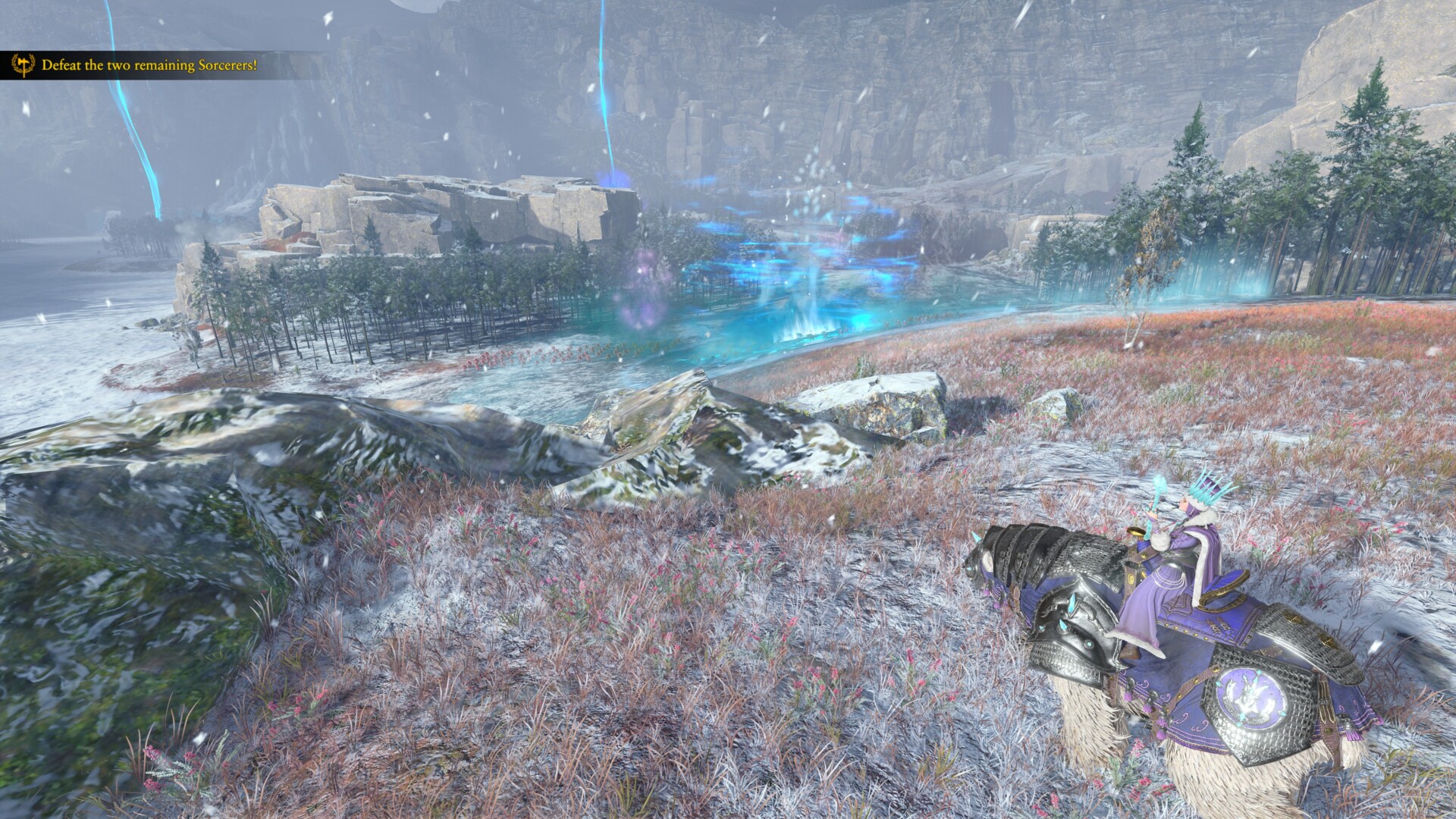 The cutscene shows that Boris is hibernating while encased in ice, and Tzeentchian forces have begun to surround him. Your goal here is to eliminate all three sorcerers. There’s one immediately to your left down the cliffs, another to your right, and the third one is all the way at the opposite side of the map.